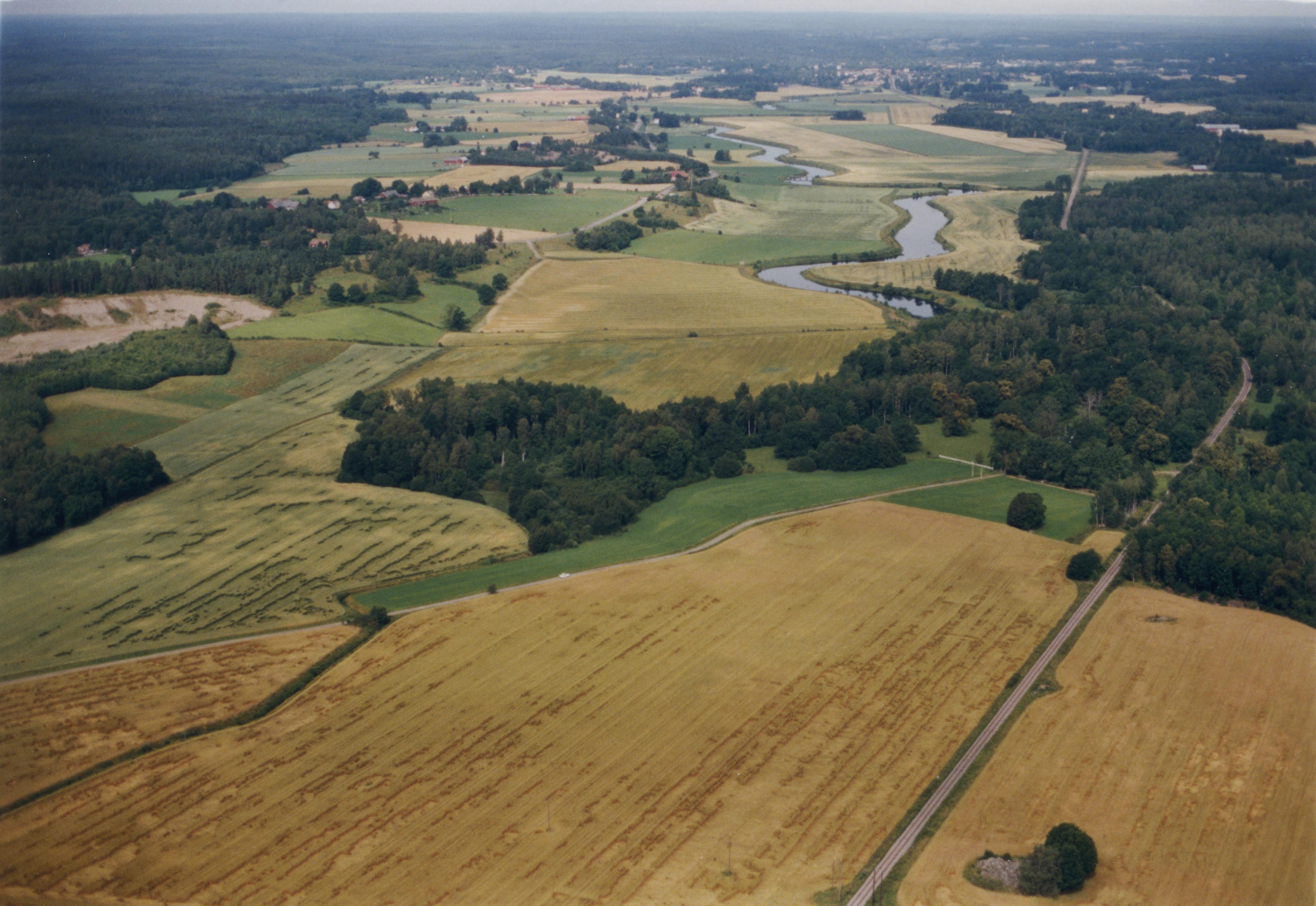 Beskrivning: Emån vid Ruda gård vid Rudalunds naturreservat. Fyndplats (slagen flinta) RAÄnr Högsby 102:1 i bildens nedre del till höger. Bilden är tagen mot (väderstreck): V