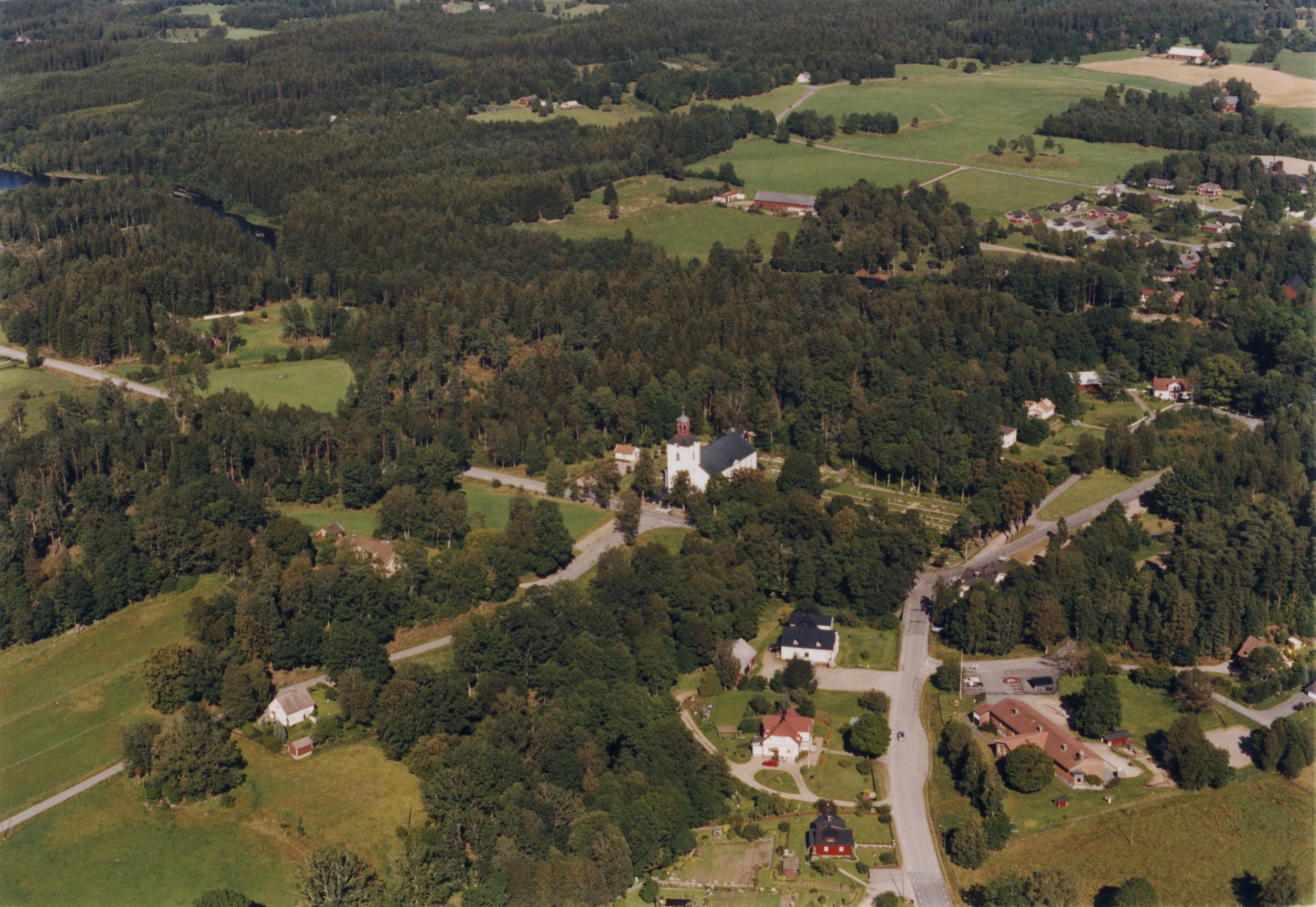 Beskrivning: Hallaryds kyrka vid ån Helge å. Bilden är tagen mot (väderstreck): Ö