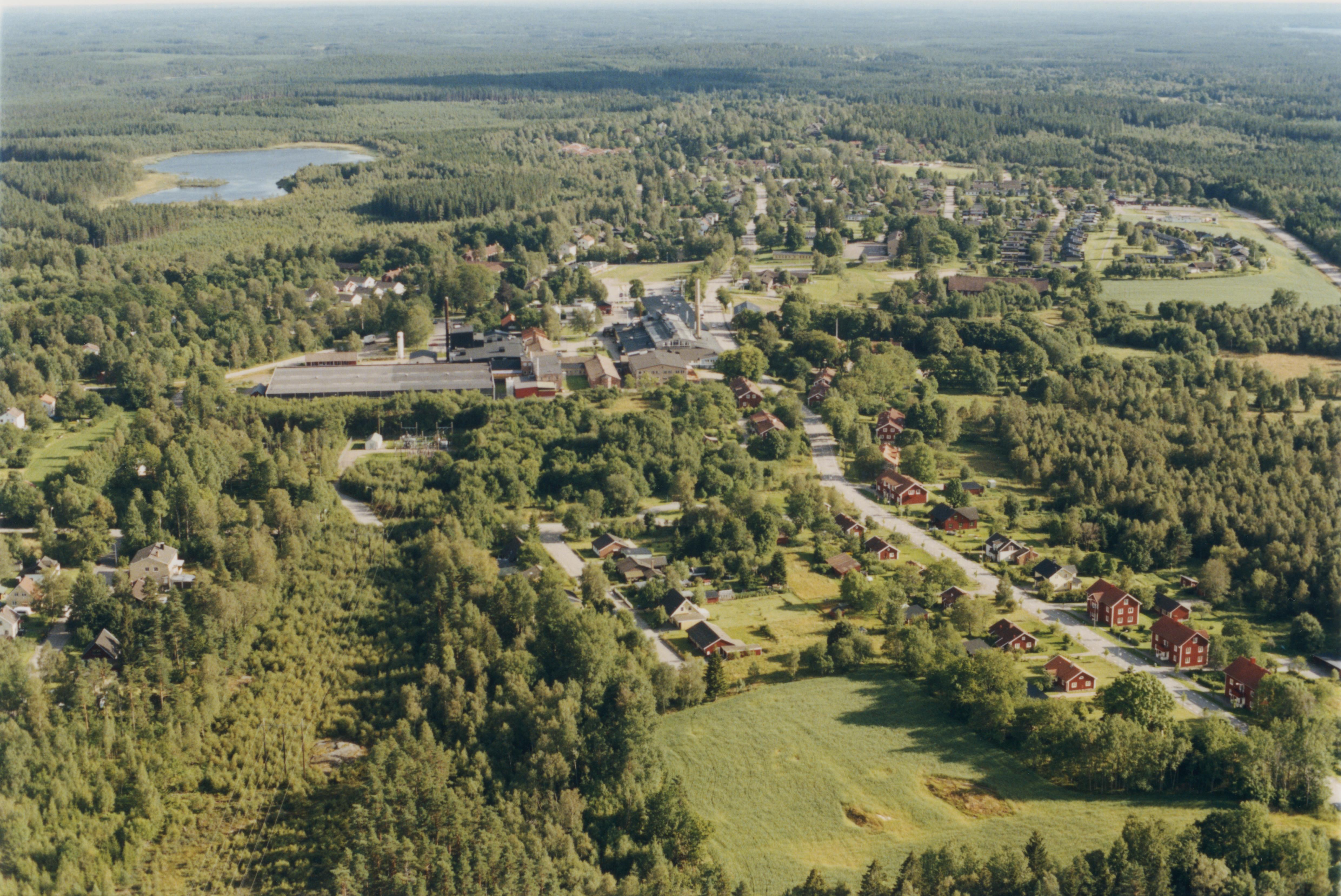 Beskrivning: Kosta bruksort. Kosta bruk / Kosta glasbruk. Uppe till vänster sjön Iglagöl. Bilden är tagen mot (väderstreck): S
