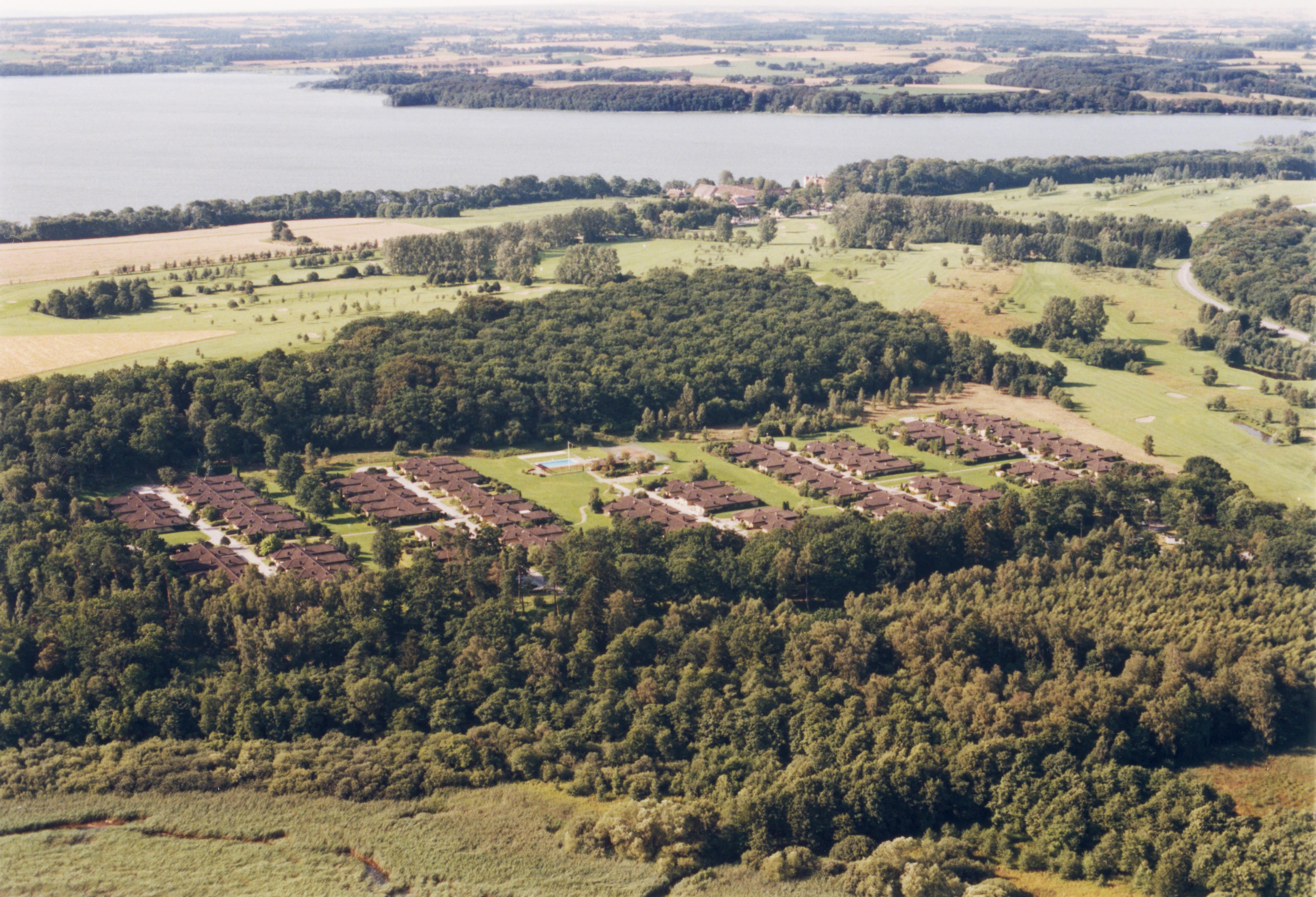 Beskrivning: Ängsbyn. I bildens övre del golfbana, Bosjöklosters kyrka och Bosjöklosters slott vid Östra Ringsjön. Bilden är tagen mot (väderstreck): SV