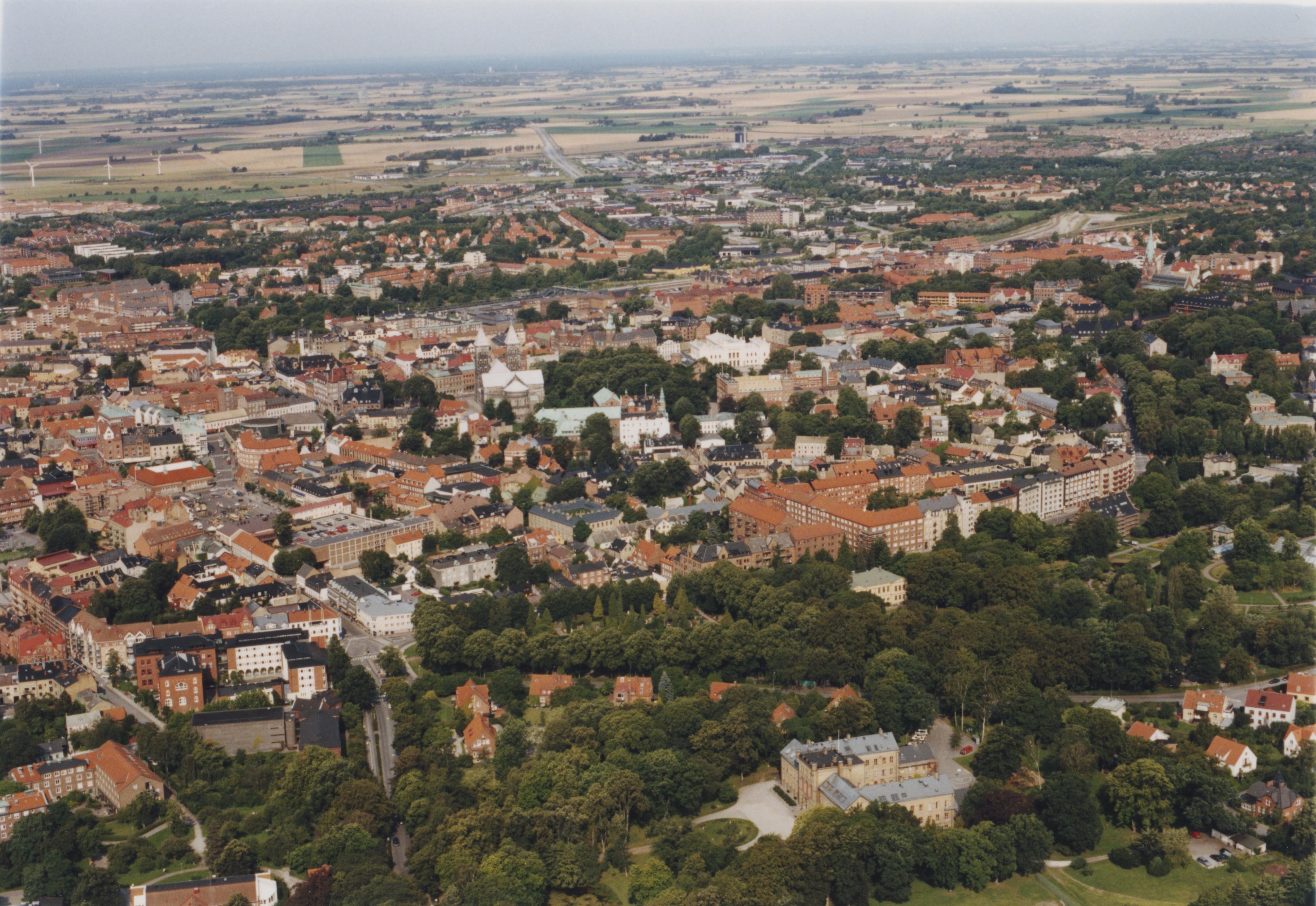 Beskrivning: Lunds stad. Lunds domkyrka till vänster om bildens mitt. Bilden är tagen mot (väderstreck): NV