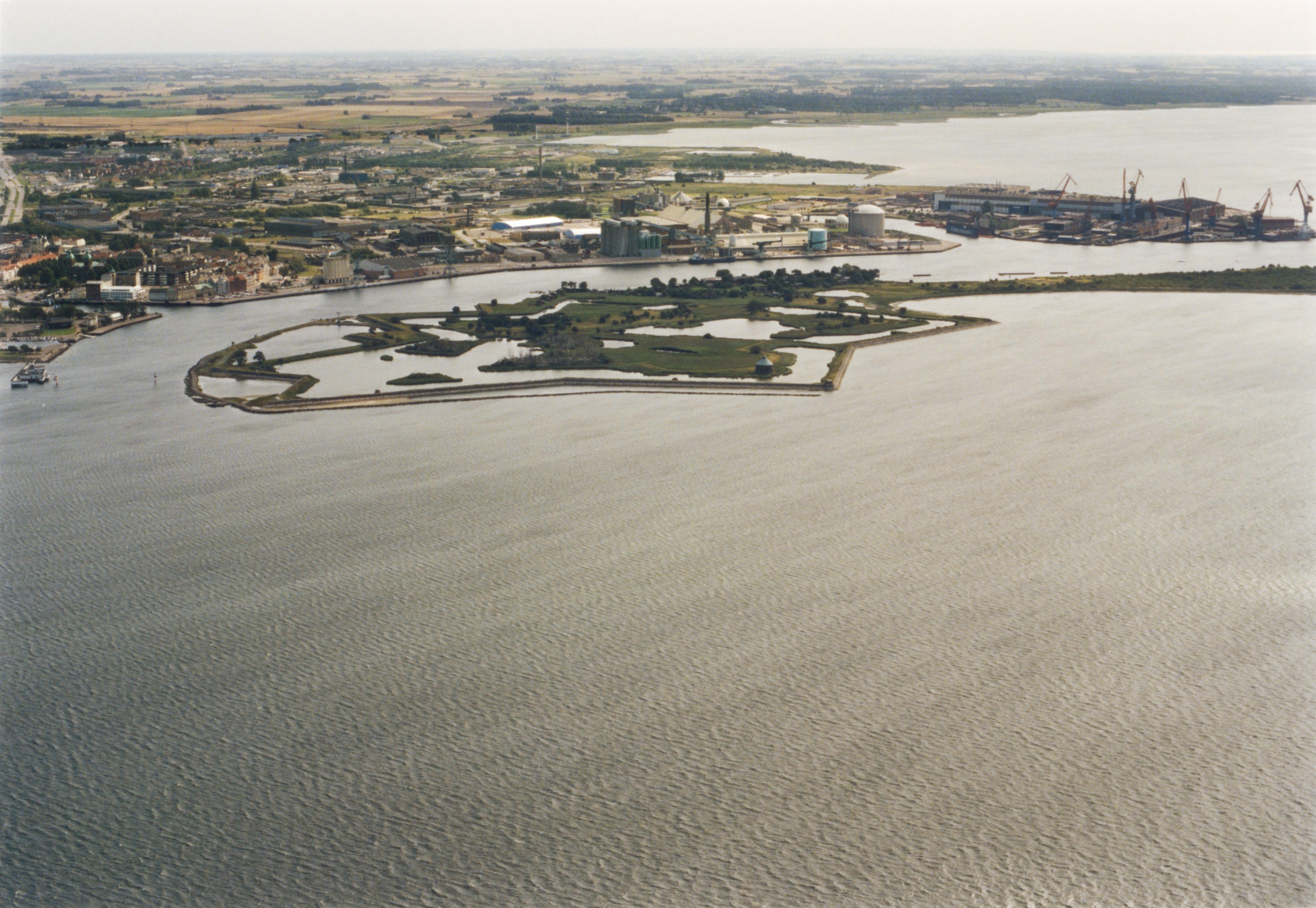 Beskrivning: Landskrona stad. Gråen fästningsruin RAÄnr Landskrona 9:1. Uppe till höger Varvsudden och Gipsön (med vindkraftverk). Bilden är tagen mot (väderstreck): Ö