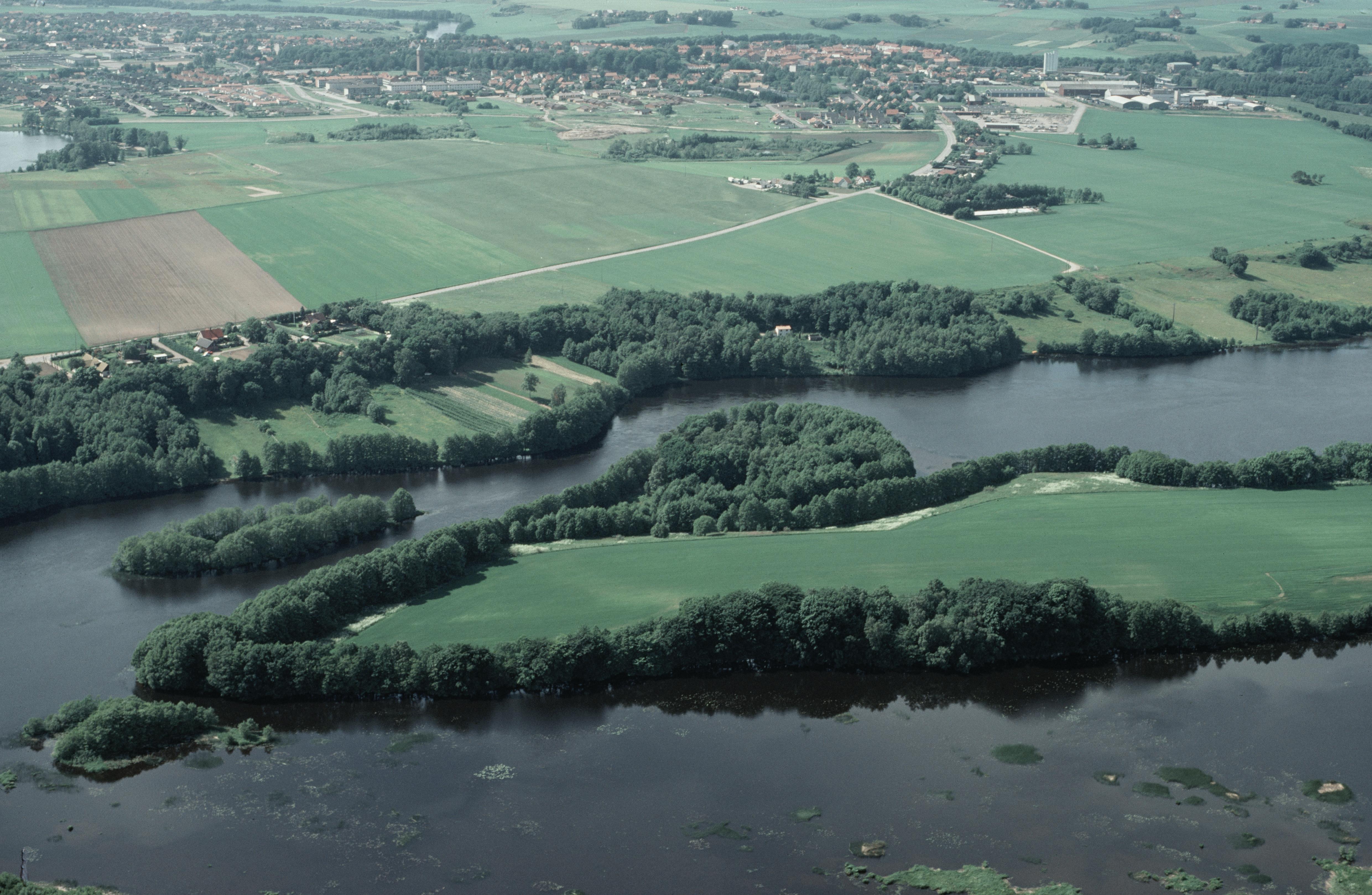 Beskrivning: Sydöstra delen i staden Laholm, Vid bildens mitt stenåldersboplats RAÄnr Laholm 87:1 på udde i ån Lagan. Bilden är tagen mot (väderstreck): SV