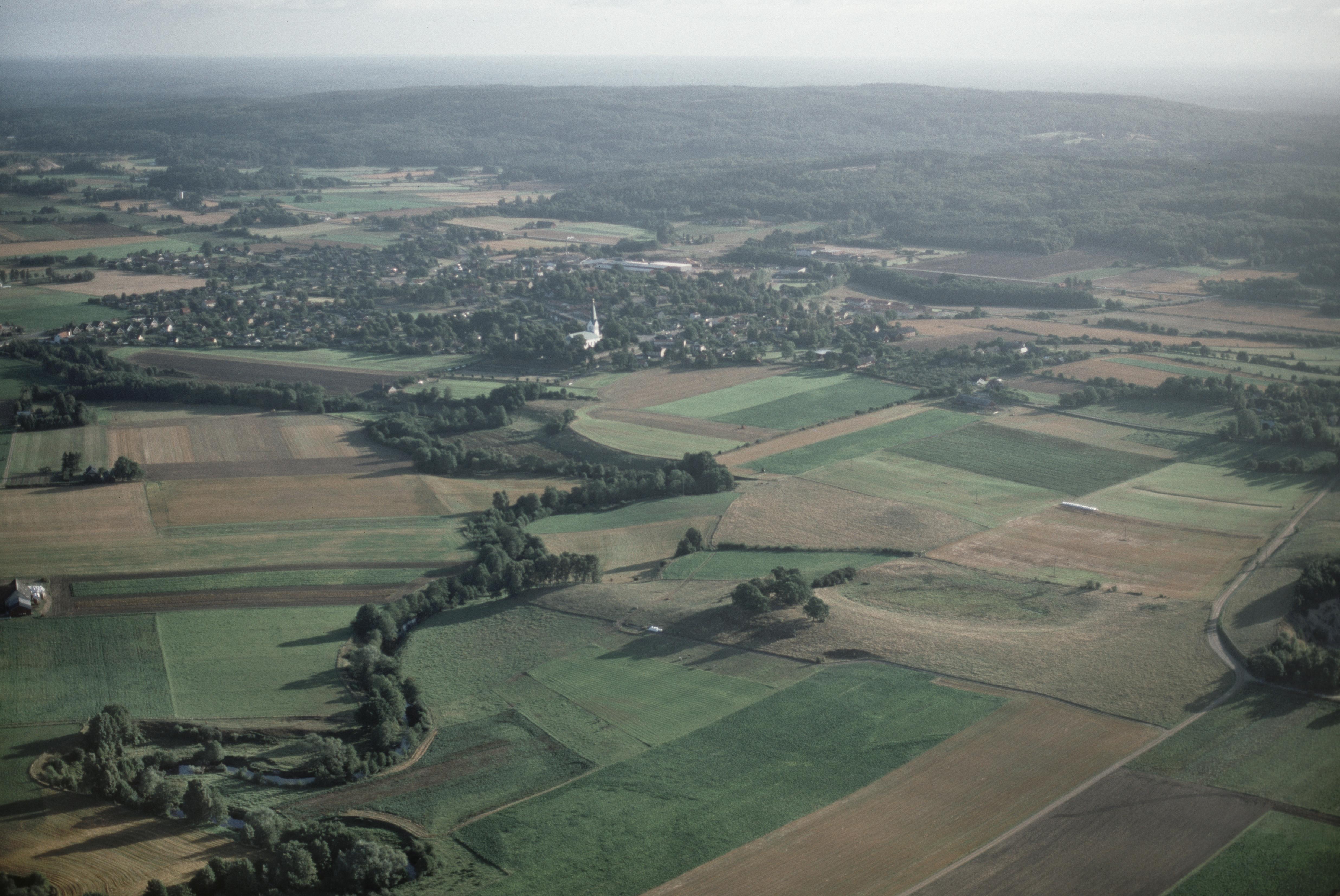 Beskrivning: Gravfält Näsums gudahage RAÄnr Näsum 5:1 vid Holjeån. I bildens övre del Näsums kyrka ock kyrkby. Bilden är tagen mot (väderstreck): NO