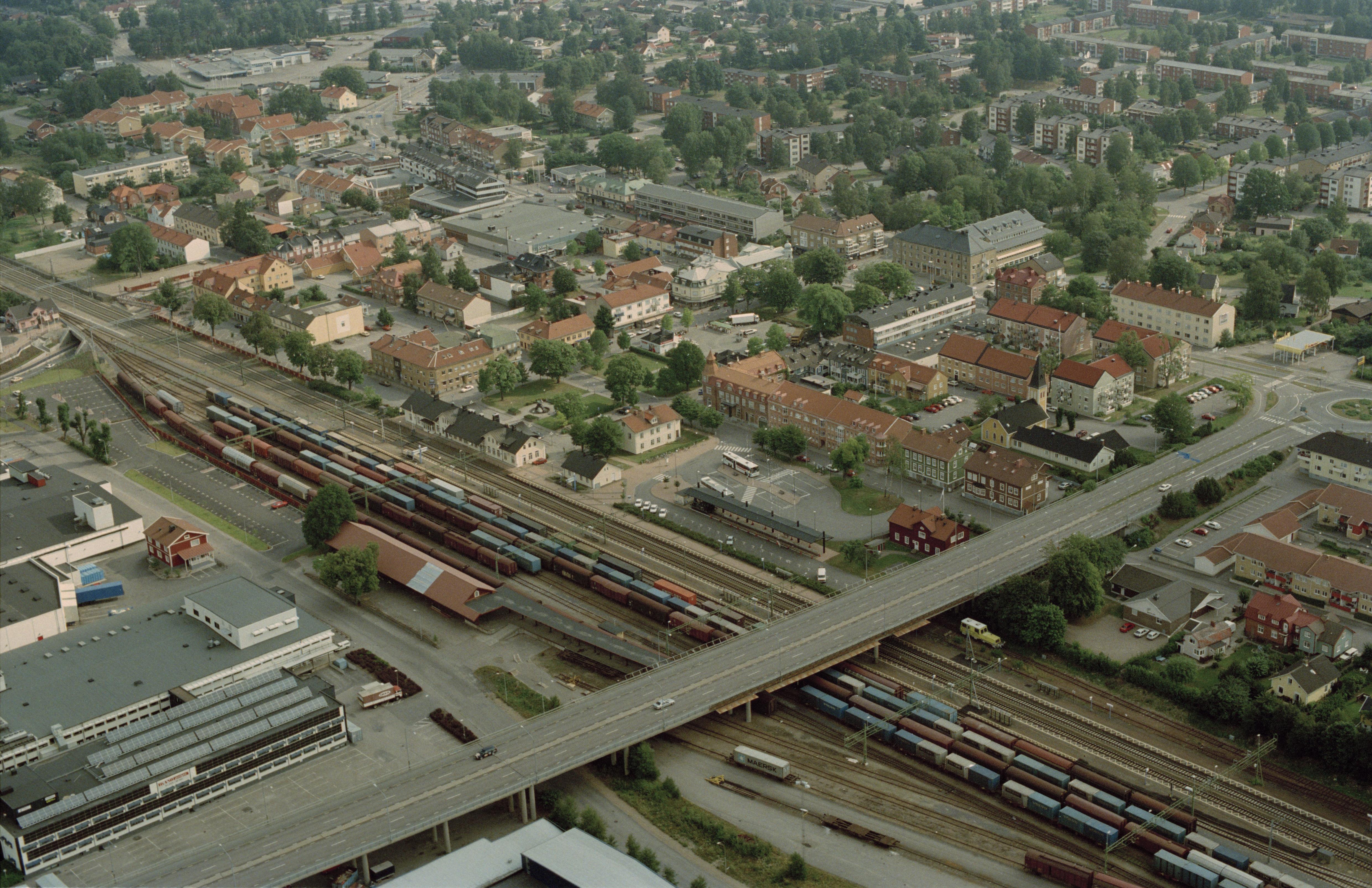 Beskrivning: Älmhults tätort (i tidigare Älmhults socken). Planmässigt uppbyggt järnvägssamhälle. Älmhults järnvägsstation. Bilden är tagen mot (väderstreck): NO