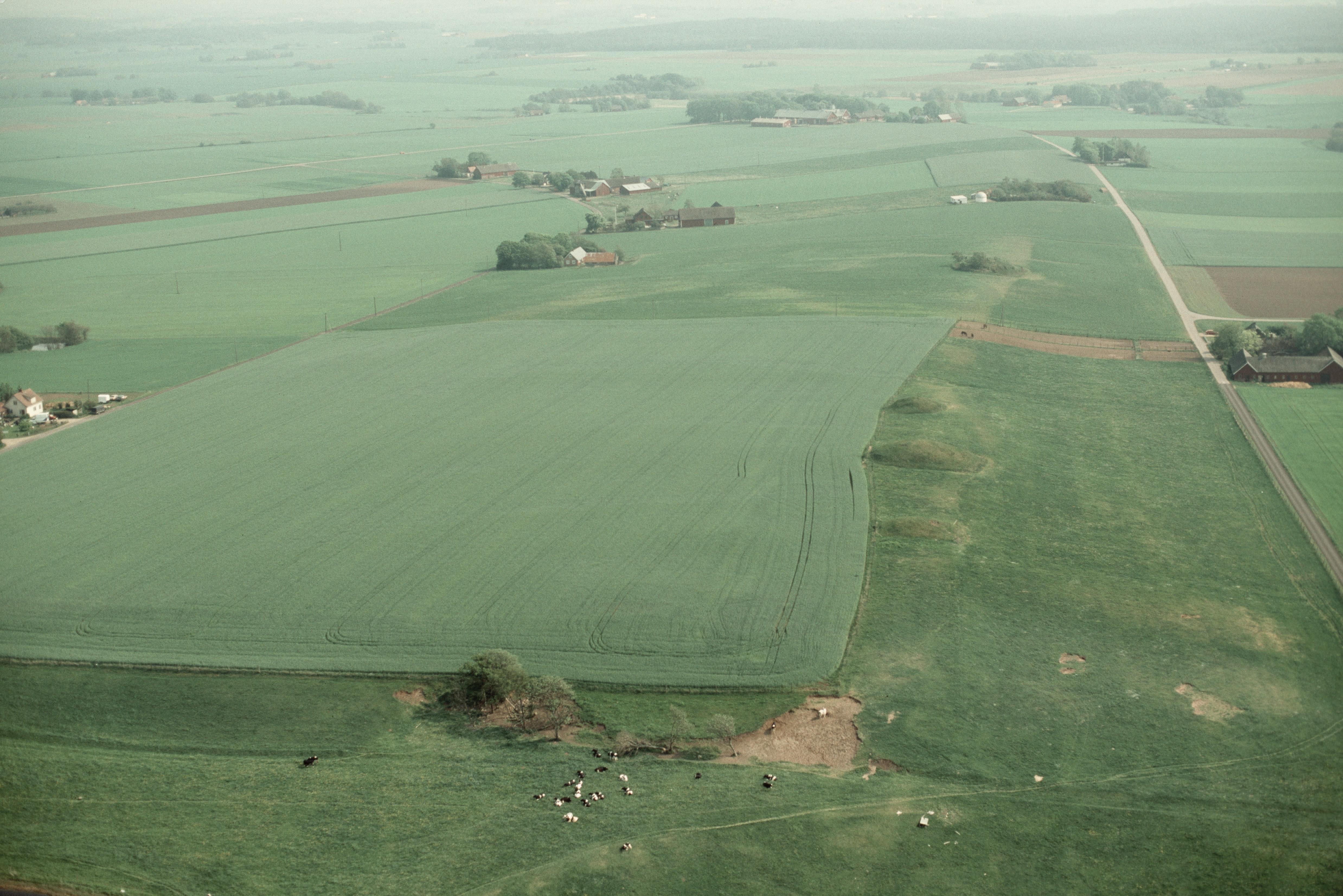 Beskrivning: Anmärkning (övrig): Riksintresse-nr/namn: N37 - Eldsbergaåsen. Socken: Eldsberga. Motivering: Sedan stenåldern befolkad slättbygd där många boplatser uppvisar lång kontinuitet. (Fornlämningsmiljö, Kyrkby, Gårdsmiljö). - Uttryck för riksintresset: Öppen fullåkersbygd med ett stort antal förhistoriska lämningar, bl a monumentala högar i dominerande läge på åsen, Eldsberga medeltidskyrka och kyrkby samt storgården Fladje med 1700-talsbebyggelse. [Texten uppdaterat av Riksantikvarieämbetet våren 2013.] Beskrivning: Truedsgården. Gravhögar RAÄnr Eldsberga 2:1, 3:1, 4:1 m.fl. till höger om bildens mitt. Bilden är tagen mot (väderstreck): S Fotosyfte: Flygbildsdokumentation