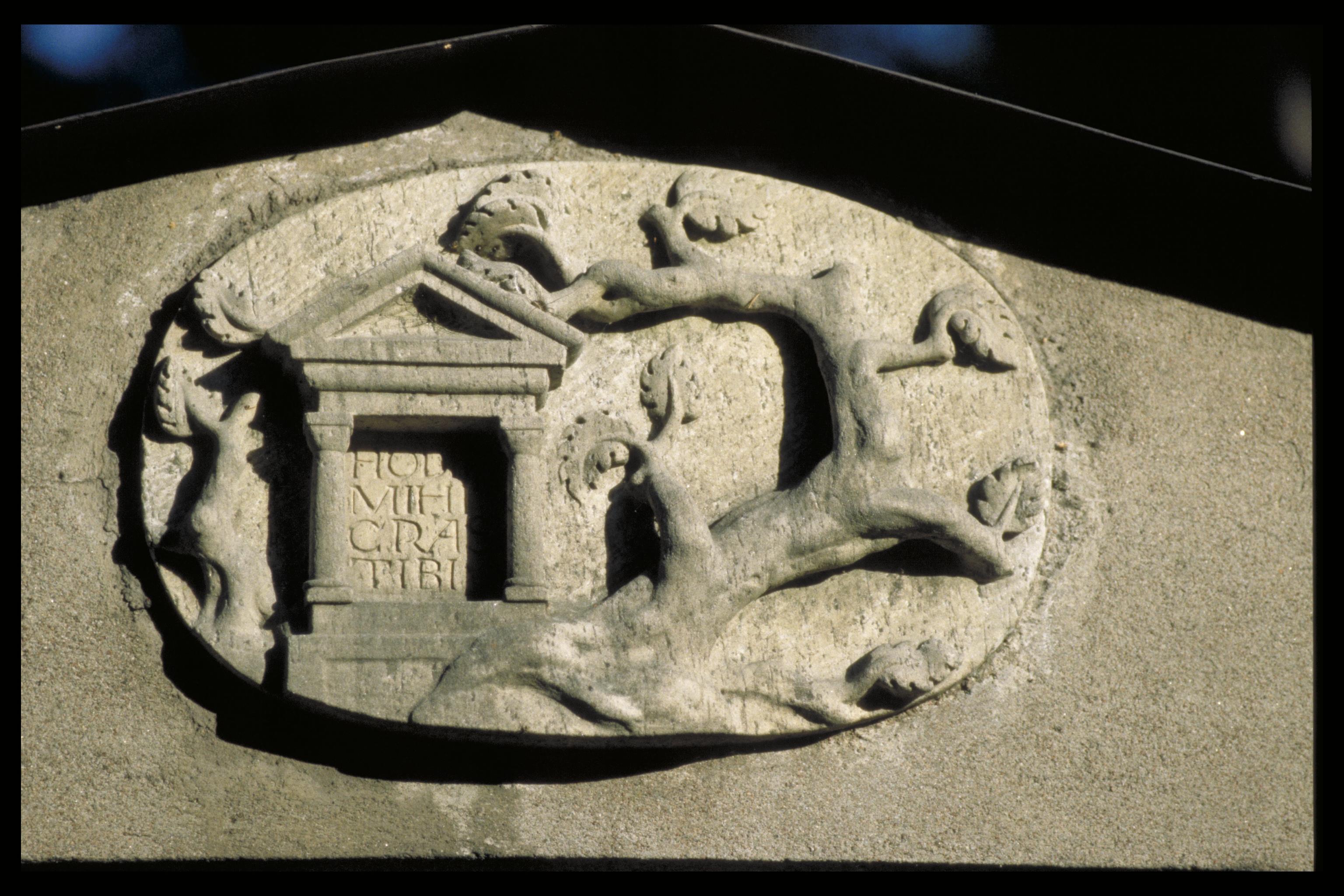 Relief på kyrkogårdsporten till Skogskapellet. Inskriptionen lyder: "Idag jag, i morgon du".