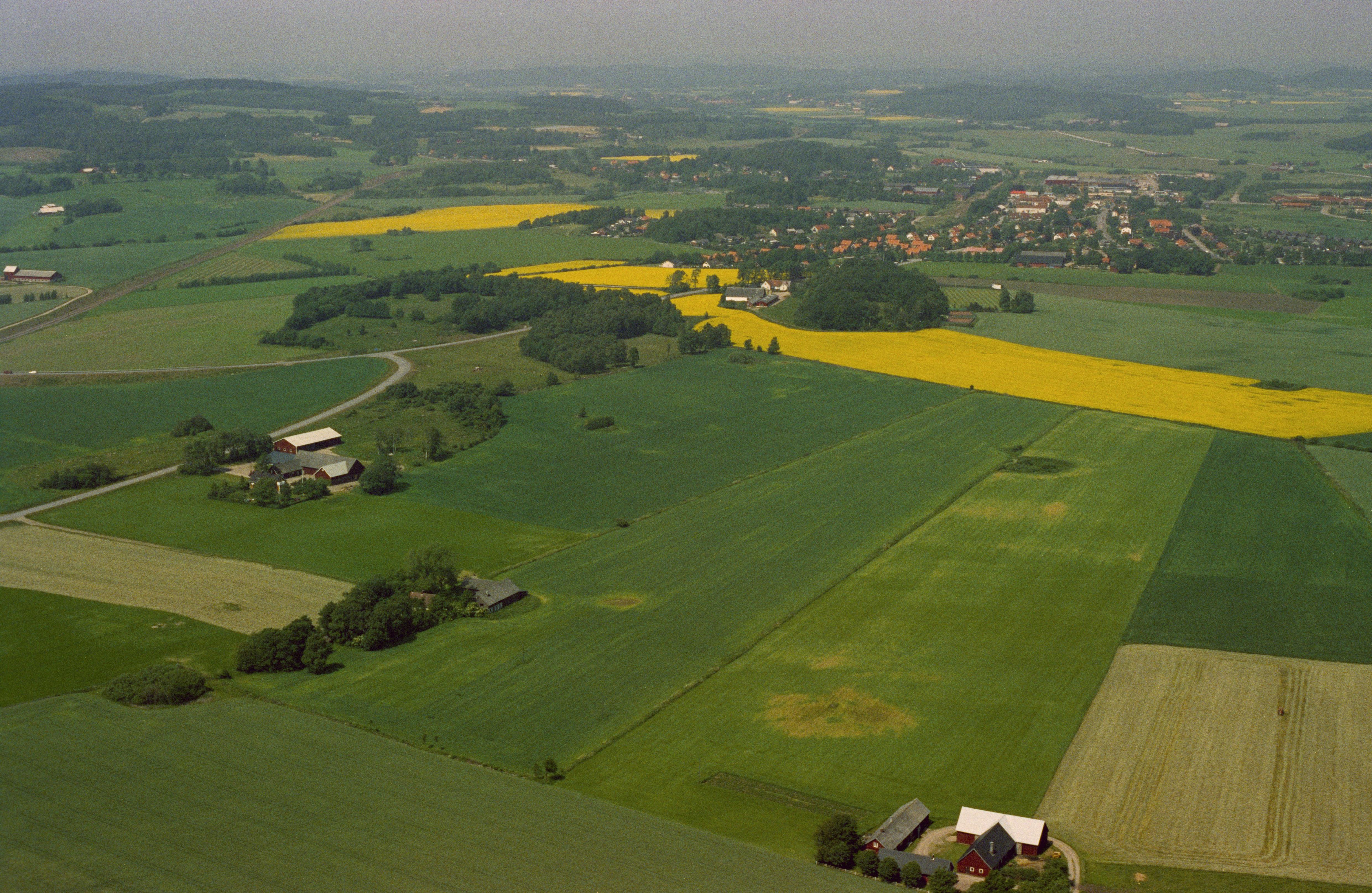 Beskrivning: Jansberg vid gränsen mellan socknen Rävinge och Getinge. I bildens övre del Hörsås, Lilla Berg och Öringe. Innan bygge av väg E6 mellan Laholm och Slöinge. Bilden är tagen mot (väderstreck): NNV