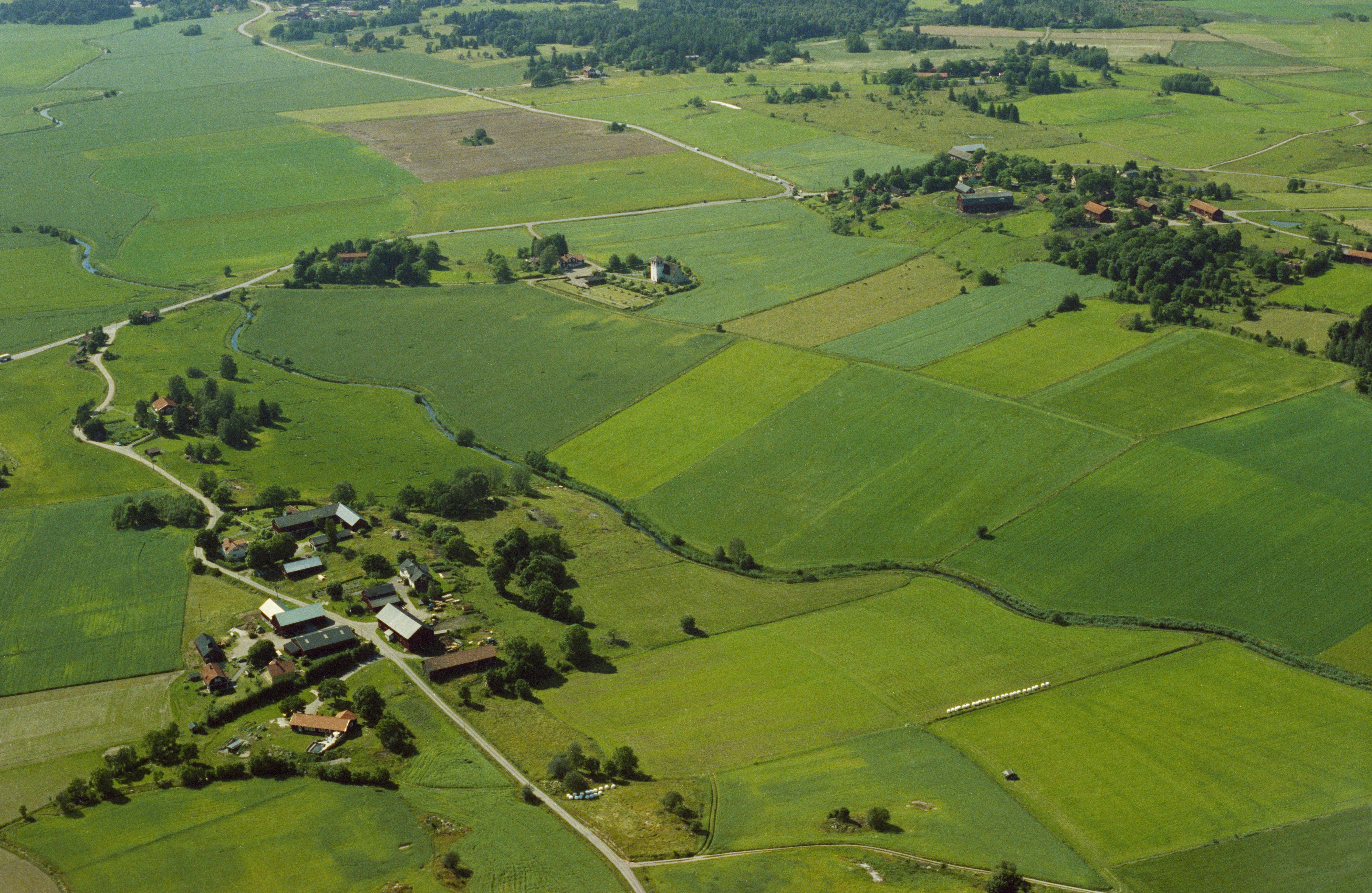 Beskrivning: Vid bildens mitt Husby-Sjuhundra kyrka och Husby kyrkby. I bildens nedre del Västra Libby med gravfält RAÄnr Husby-Sjuhundra 86:1, 33:1 m.fl. Bilden är tagen mot (väderstreck): NV