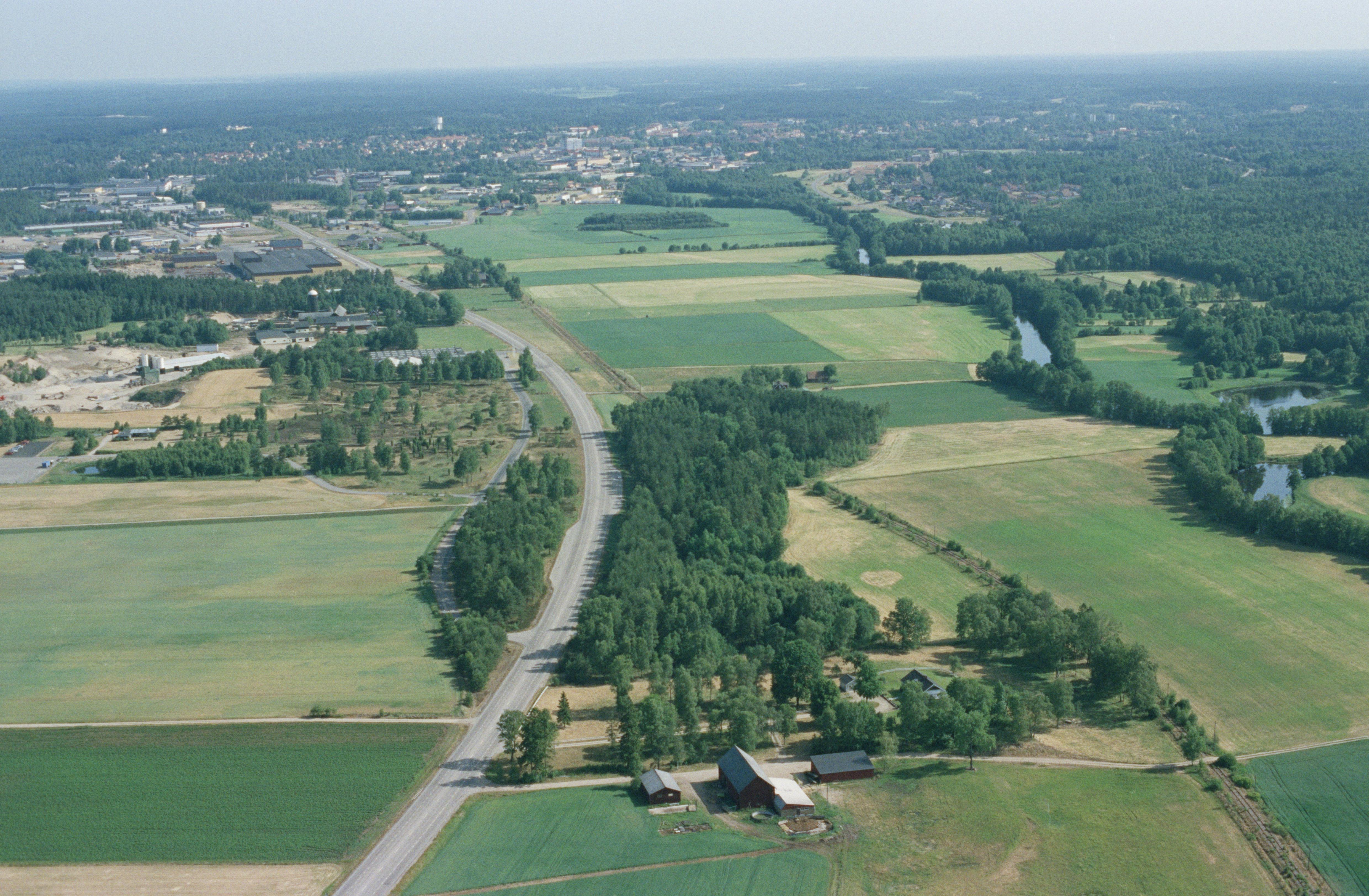 Beskrivning: Gravfält Kånna högar med runristning och hällristning RAÄnr Kånna 24:1-3 till vänster om bildens mitt. Kånna tätort i bildens övre del. Bilden är tagen mot (väderstreck): NNO