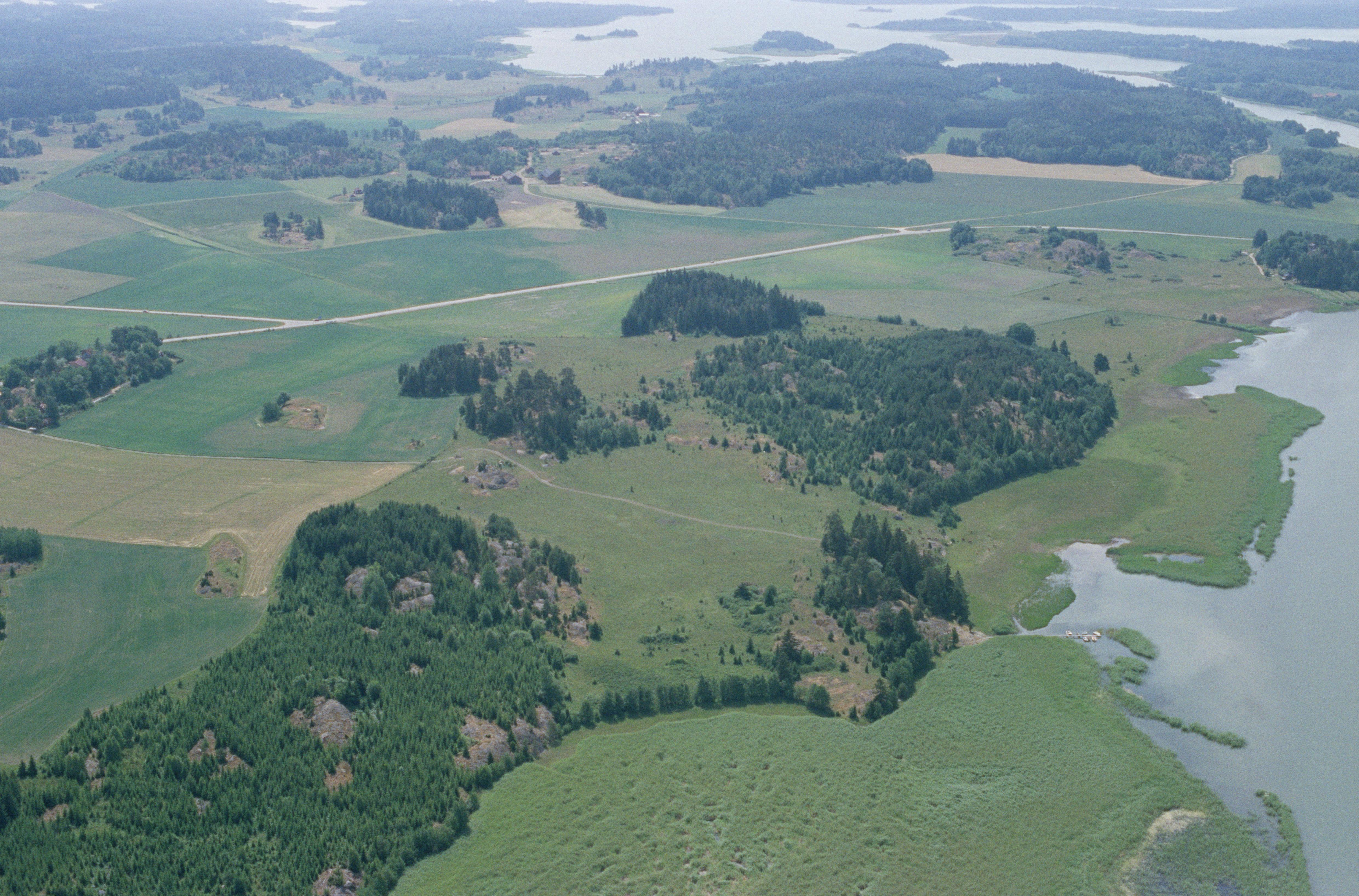 Beskrivning: Mörkö, västra delen. Ängar på Kasholmen vid Norafjärden. Vid bildens mitt gravfält RAÄnr Mörkö 82:1. Bilden är tagen mot (väderstreck): S