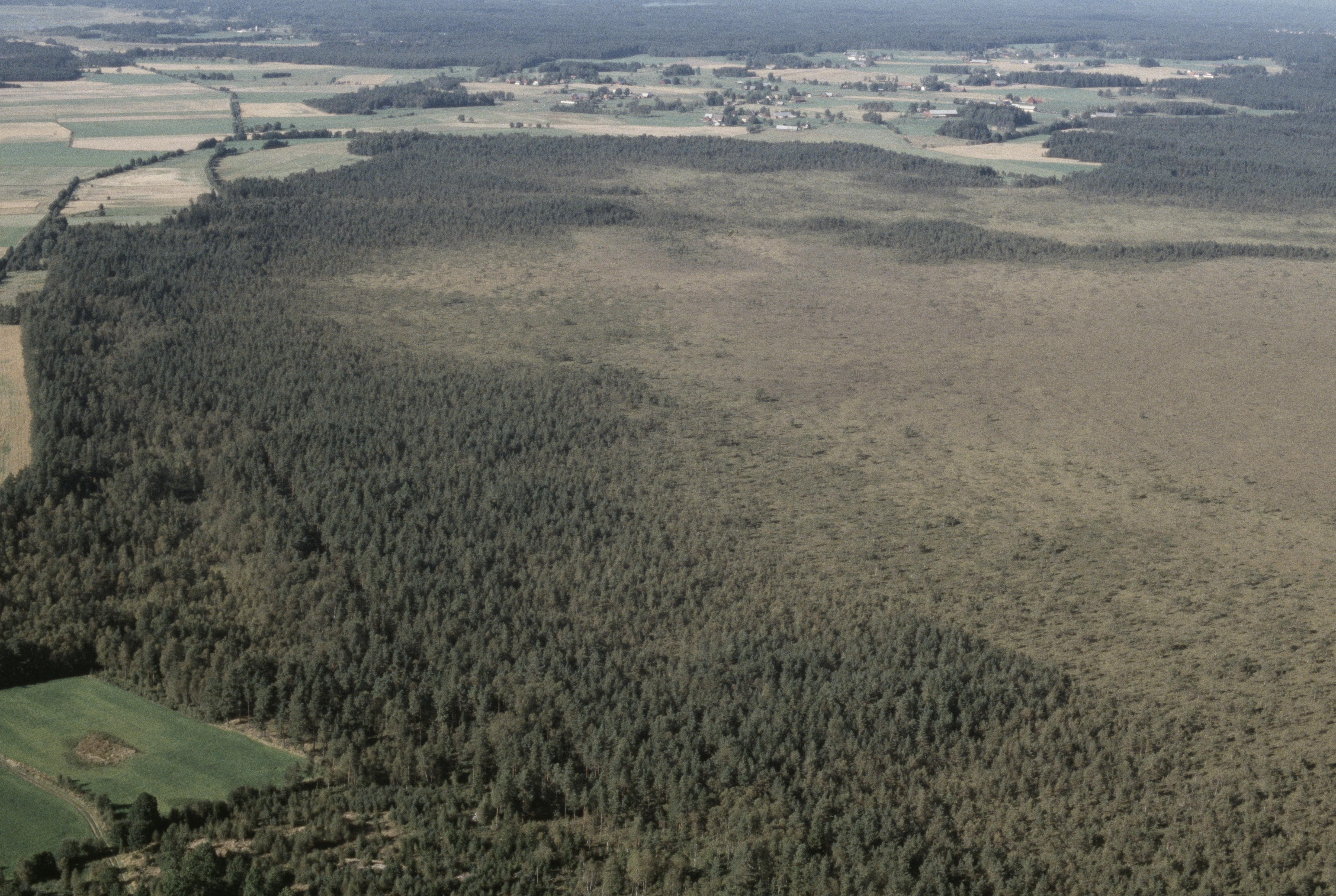 Beskrivning: Draftinge mosse vid gränsen mellan socknen Ås och Torskinge. Draftinge by i bildens övre del. Finnvedens folkland. Bilden är tagen mot (väderstreck): N