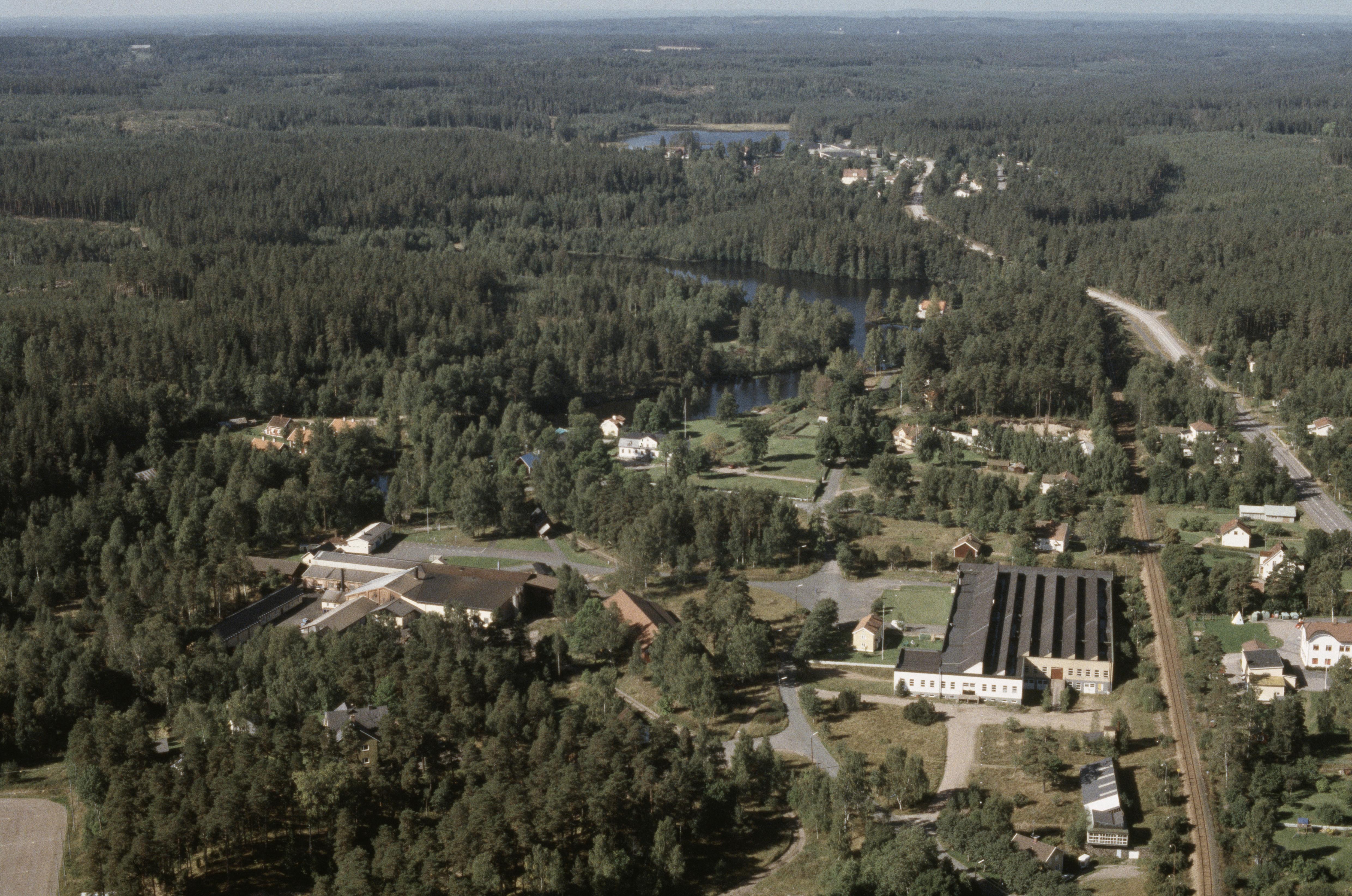Beskrivning: Bruzaholms bruk. Bruzaholms herrgård till vänster vid bildens mitt. Järnbanespåret genom Bruzaholm. Stuveryd i bildens övre del. Bilden är tagen mot (väderstreck): SV