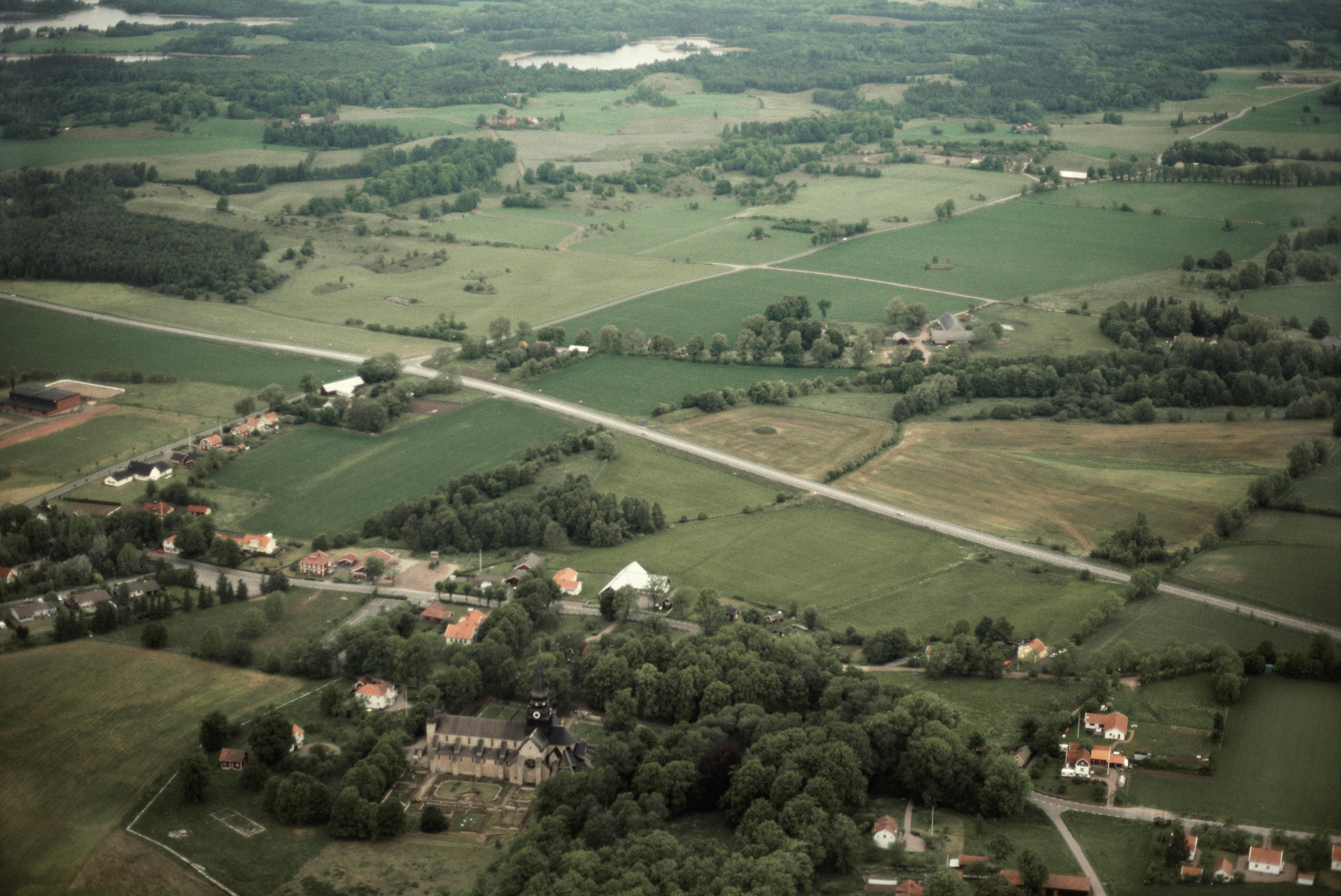 Beskrivning: Varnhems klosterkyrka (skrivs även Varnhems kyrka) och ruinen Varnhems kloster RAÄnr Varnhem 94:1. Bilden är tagen mot (väderstreck): NNV