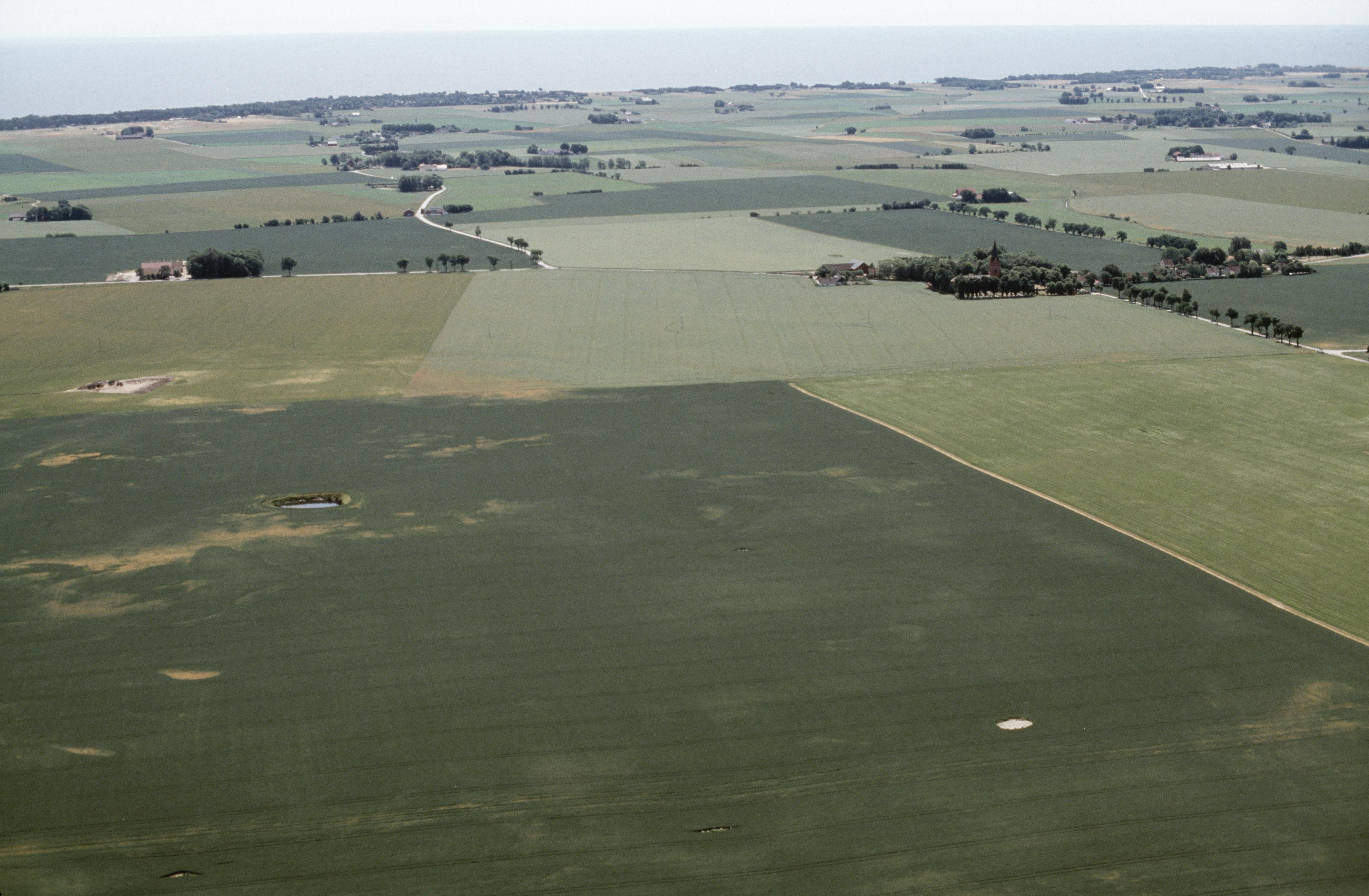 Beskrivning: Källstorps kyrka och kyrkby uppe till höger om bildens mitt. Bilden är tagen mot (väderstreck): SV