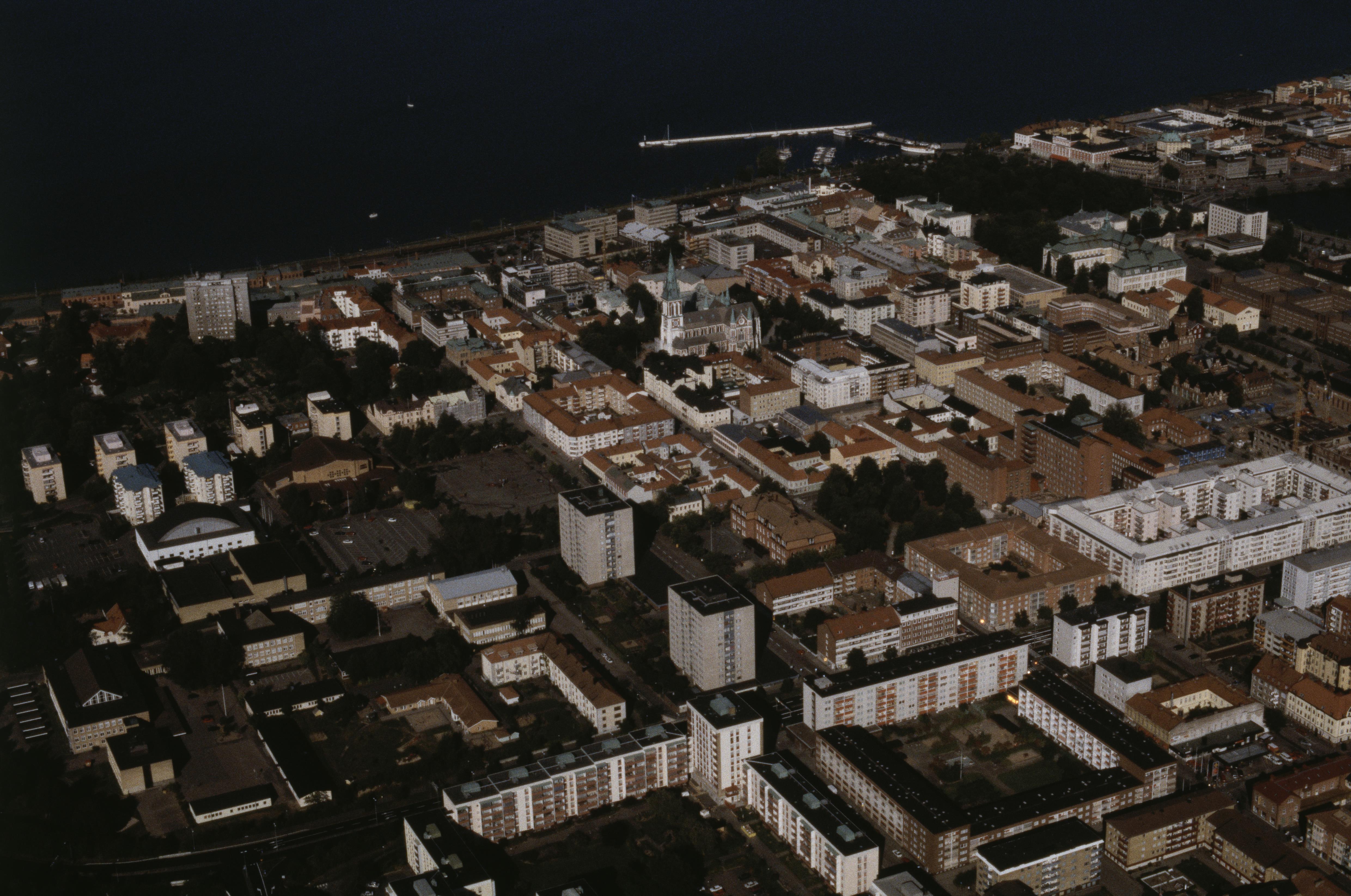 Beskrivning: Jönköpings stad vid sjön Vättern. Sofia kyrka vid bildens mitt. Bilden är tagen mot (väderstreck): NO