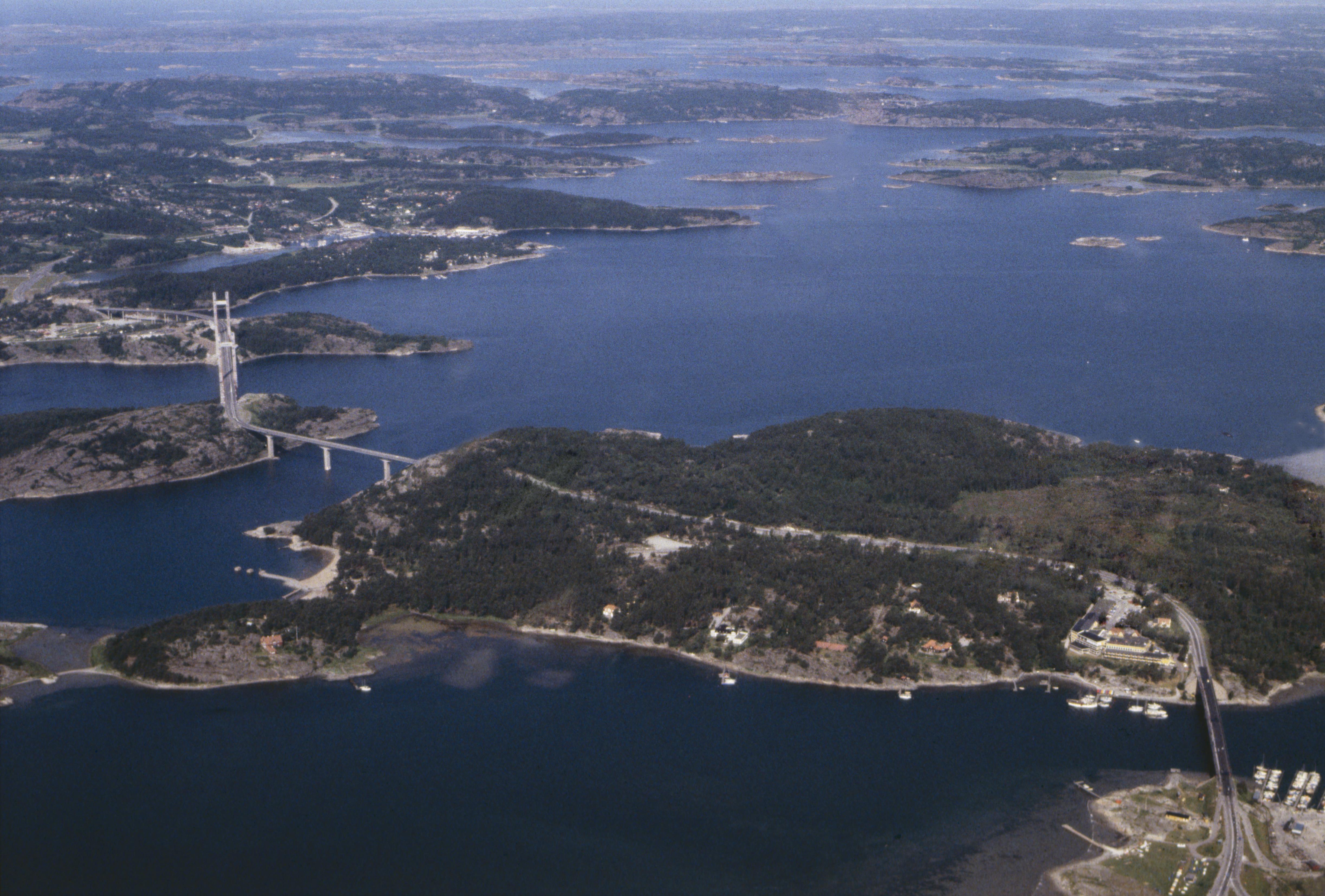 Beskrivning: Källösund i Södra Stenungsöns naturservat och Källön. Nybyggda Tjörnbron vid bildens mitt. I bildens övre del Myggenäs i Valla socken. Bilden är tagen mot (väderstreck): VNV