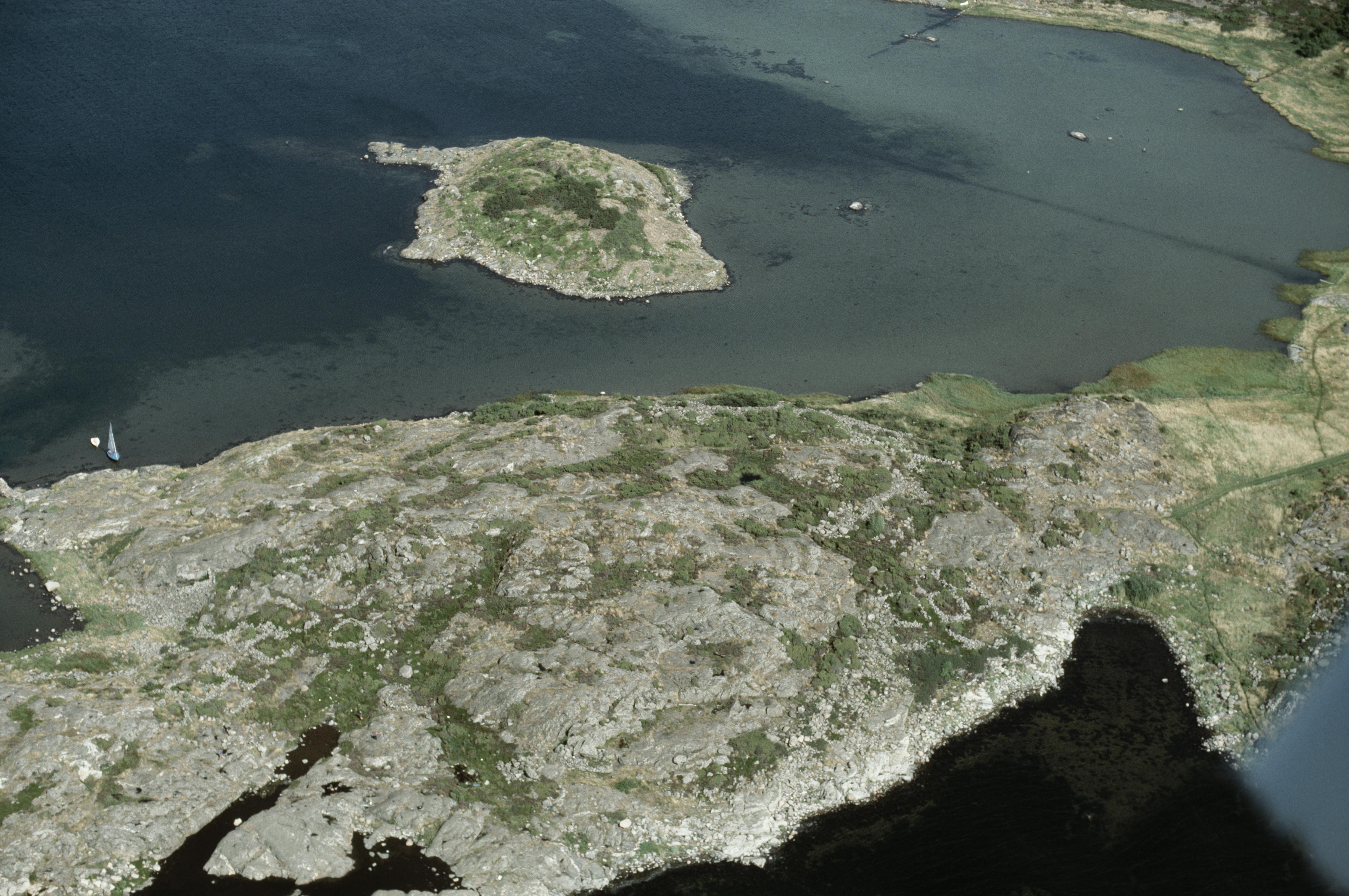 Beskrivning: Tomtningar och fiskelägeslämningar på udden vid Vinbärsholmen. Fiskeläge RAÄnr Vallda 59:1. Tollholmen i bildens övre del. <NB! Bilden har en skada nere i höger hörn.> Bilden är tagen mot (väderstreck): NO