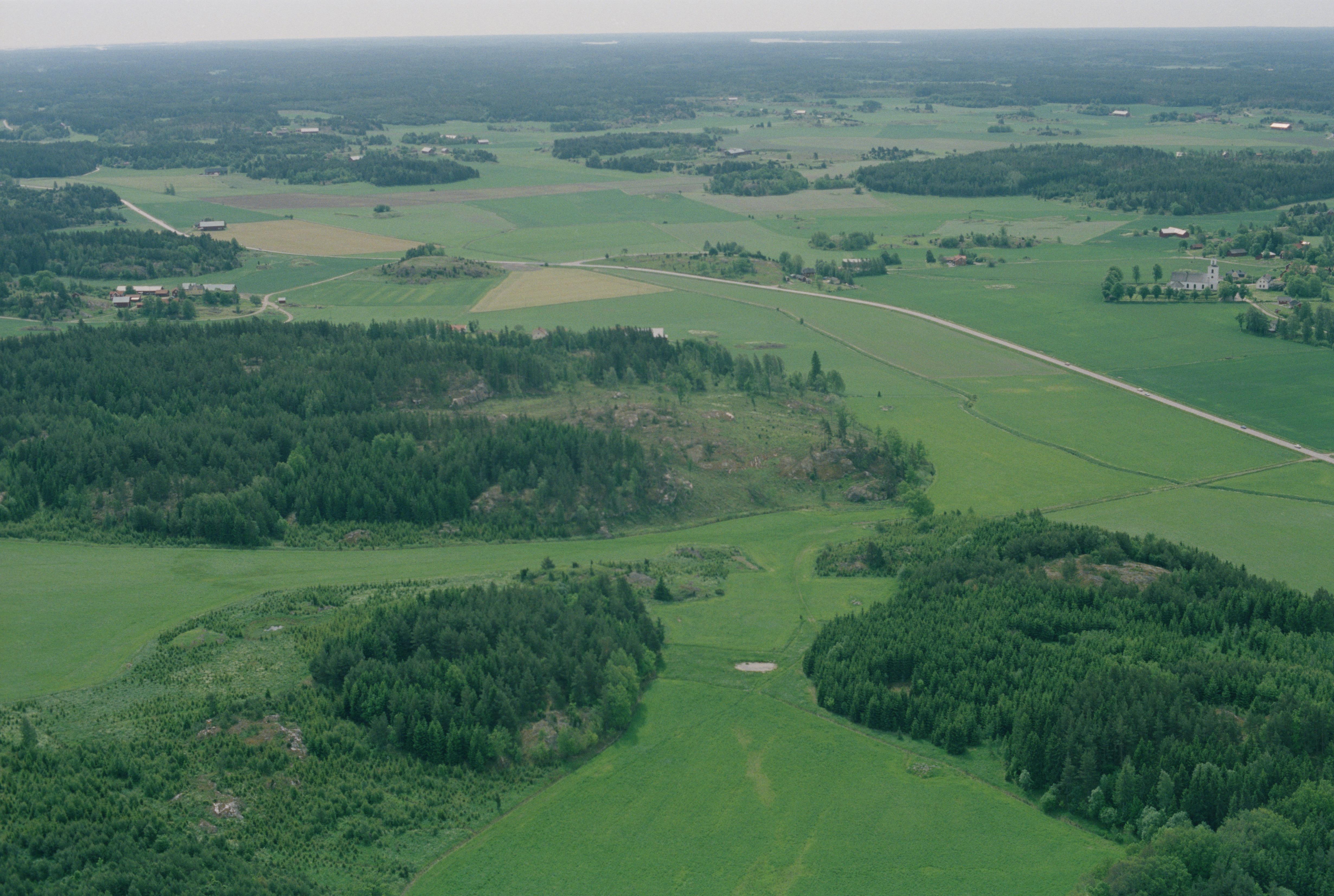 Beskrivning: Häradshammars kyrka uppe till höger. Fornlämningsområde vid Myrby. Boplats RAÄnr Häradshammar 443:1, stensättning och hägnad Häradshammar 277:1-2 m.fl. vid bildens mitt. Bilden är tagen mot (väderstreck): SV