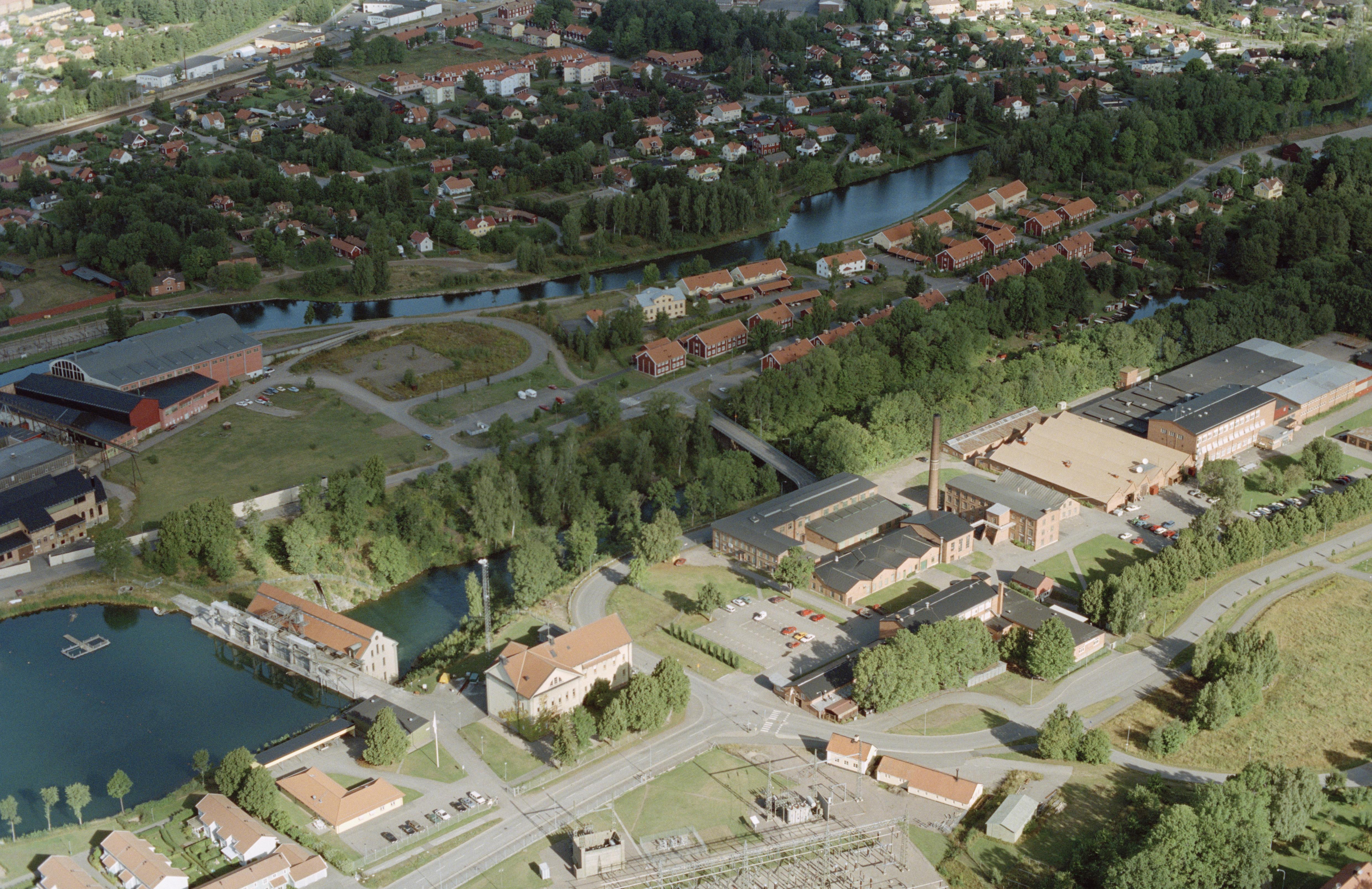 Beskrivning: Göta kanal och Motala ström vid Motala tätort. Till vänster Motala kraftverk. Vid bildens mitt Verkstadsön och Motala verkstad. Bilden är tagen mot (väderstreck): NNV