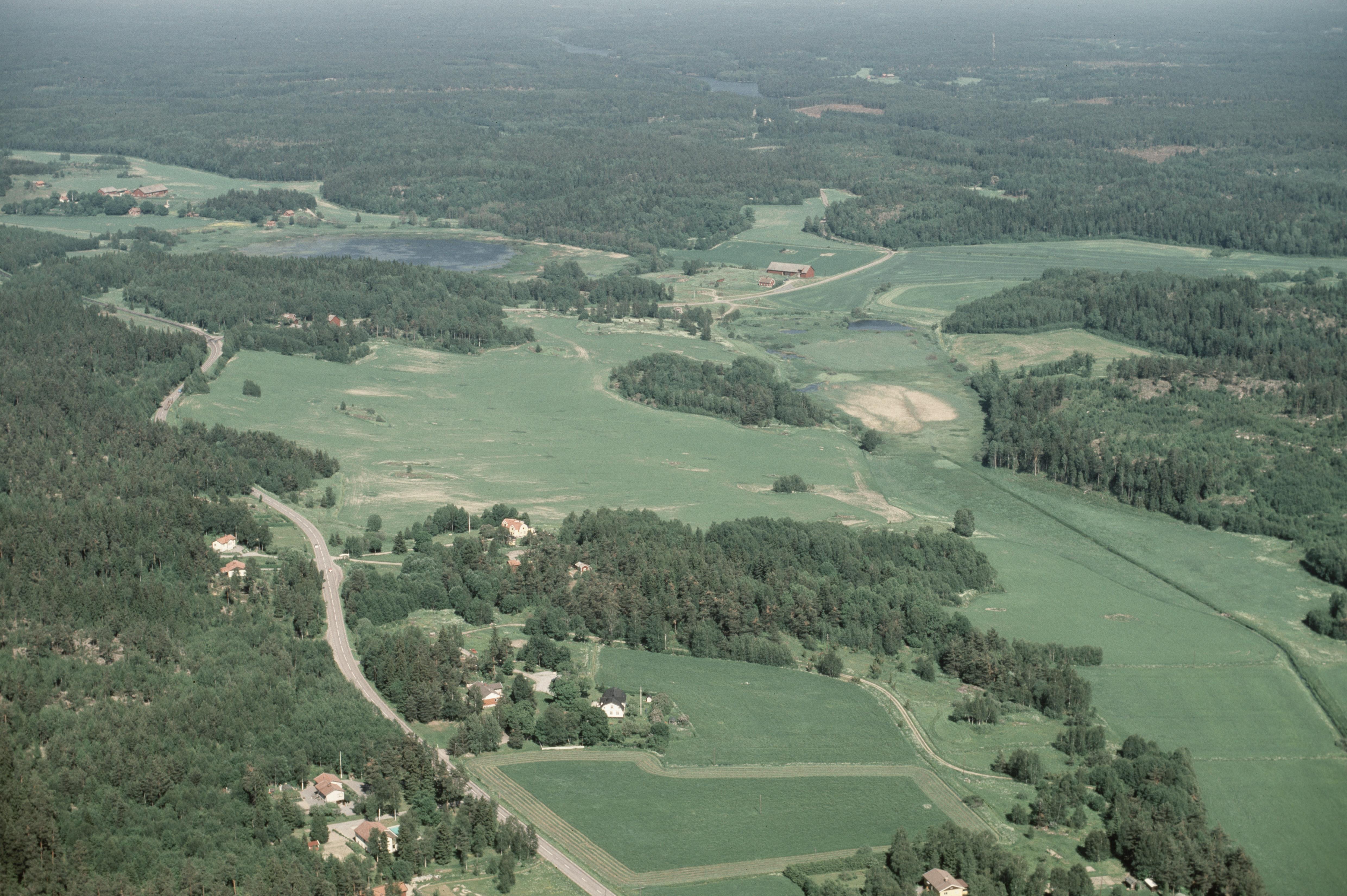 Beskrivning: Dalgången nordost om Össeby-Garns by. Norrdal och Lövhamra nere till vänster. Vid bildens mitt lägenhetsbebyggelse Dragonhagen RAÄnr Össeby-Garn 184:1 . I bildens övre del Uddra mellan Hundsjön och Norrsjön. Bilden är tagen mot (väderstreck): ONO