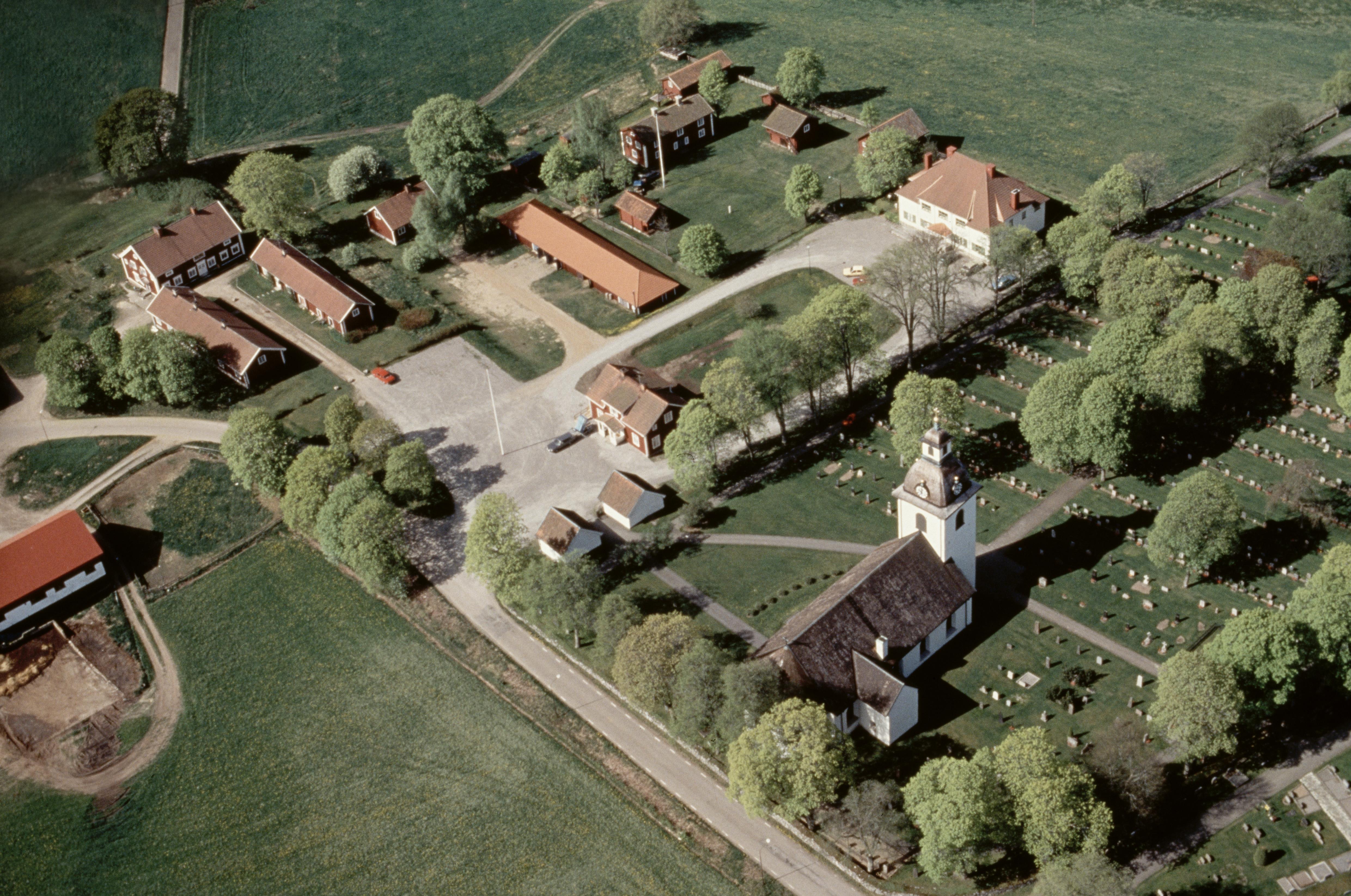 Beskrivning: Lerbäcks kyrka, Lerbäcks hembygdsgård RAÄnr Lerbäck 130:1 och Gamla gästgivaregård Lerbäck 148:1. Bilden är tagen mot (väderstreck): VSV