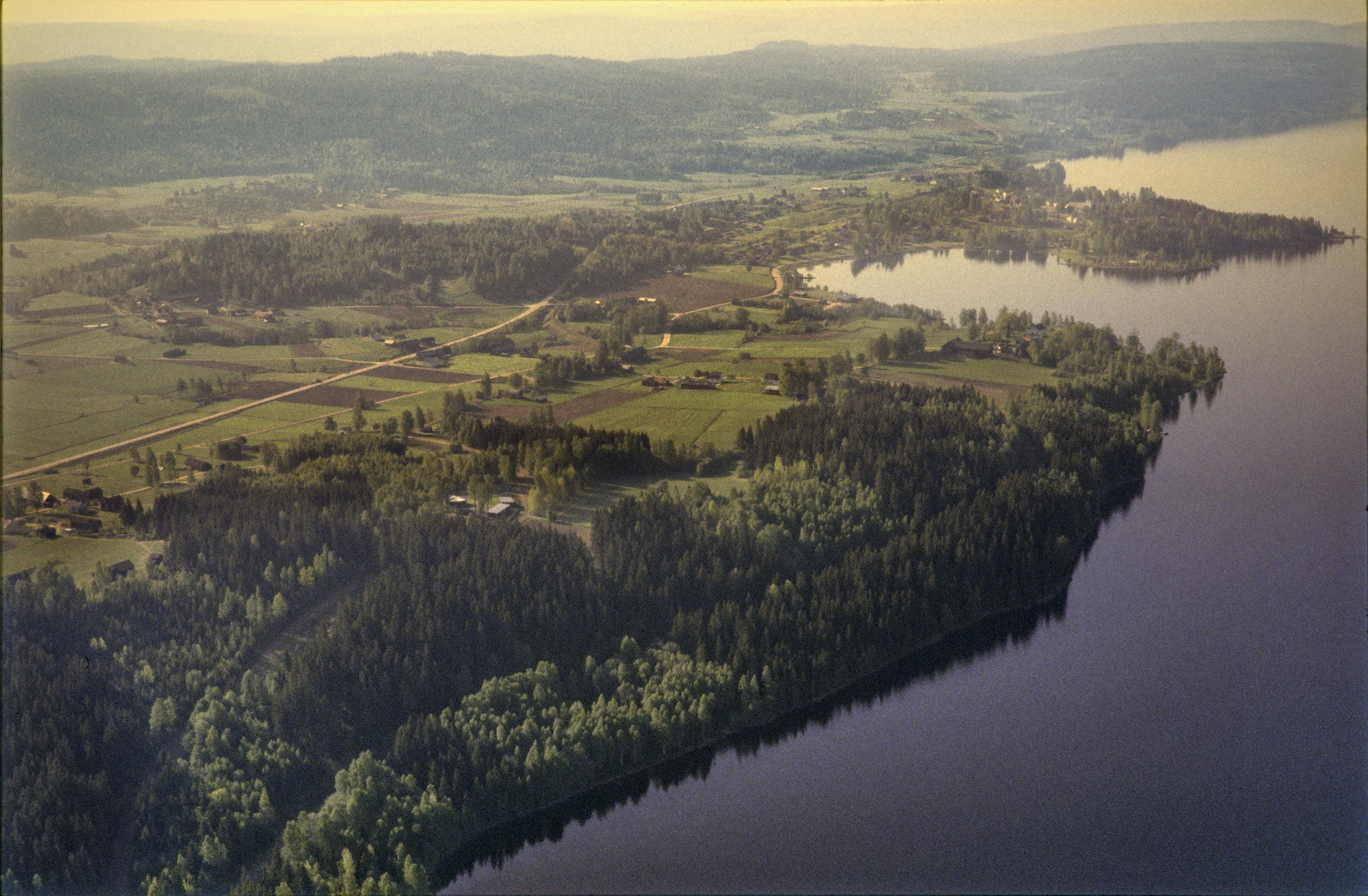 Beskrivning: Sjön Övre Fryken. Tjärgrop RAÄnr Lysvik 15:1 i Östra Berga vid bildens mitt. Uppe till höger Lysviks kyrka och kyrkby. Bilden är tagen mot (väderstreck): SO