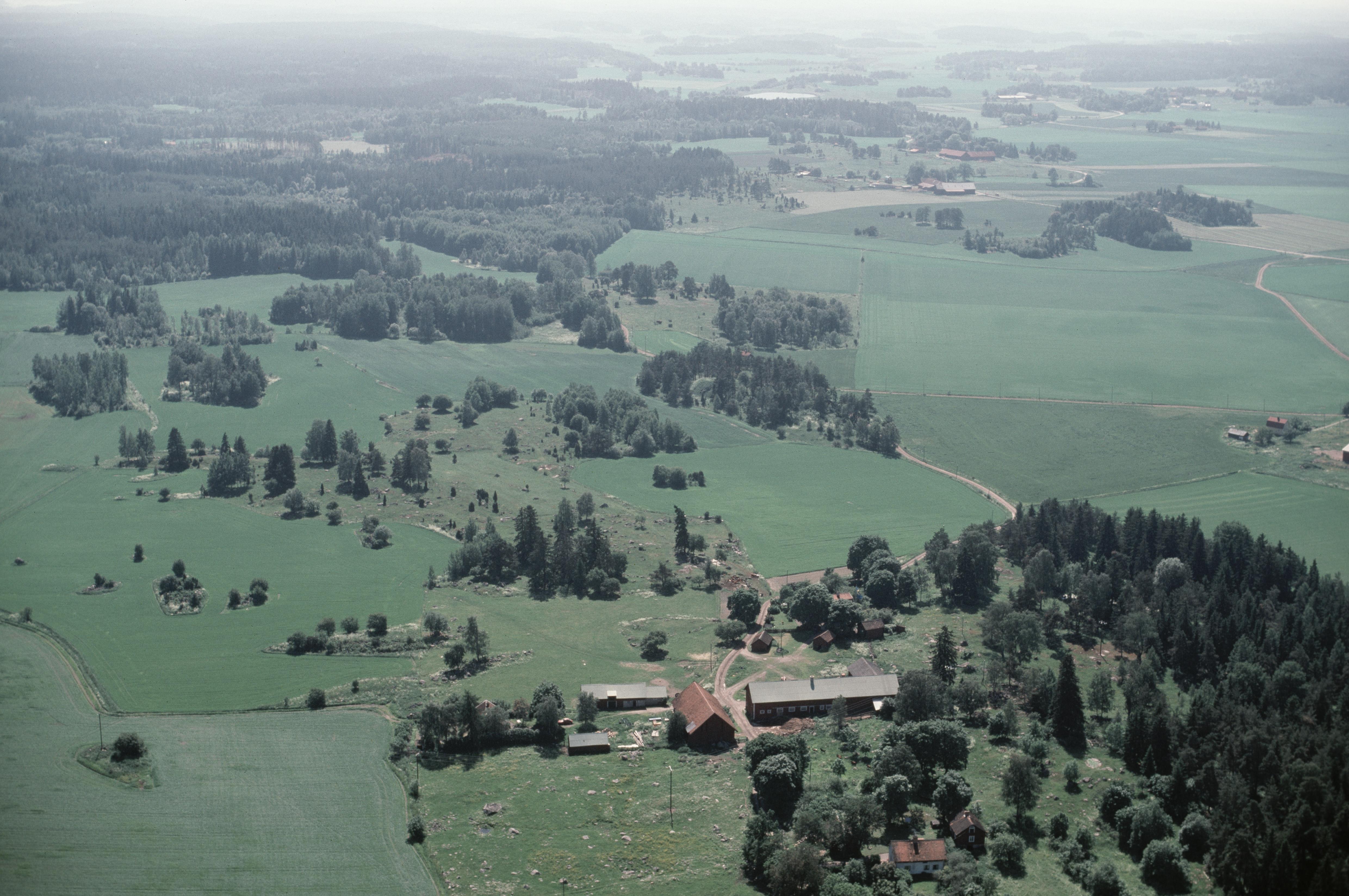 Beskrivning: Vid sockengränsen mellan Orkesta (till vänster) och Markim (till höger). Gravfälten RAÄnr Orkesta 32:1 och Orkesta 31:1 vid området Vaxtuna till vänster i bildens nedre del. I bildens högra kant skymtar Viby gård i socknet Markim. Bilden är tagen mot (väderstreck): SV