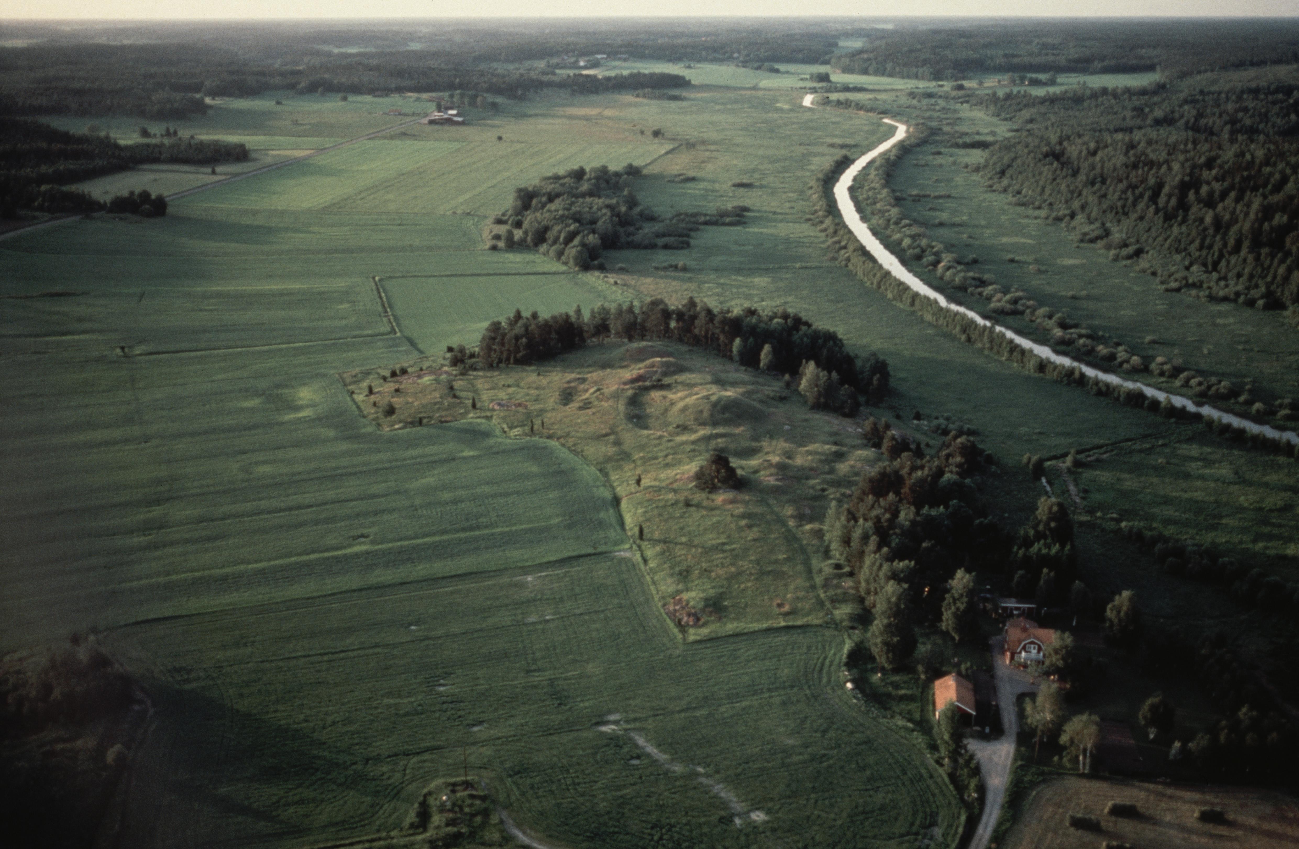 Beskrivning: Helgöåns dalgång i Långhundraleden. Ån markerar gränsen mot socknet Össeby-Garn (till höger). Gravfältet Sjökullarna RAÄnr Vada 10:1. Bilden är tagen mot (väderstreck): N