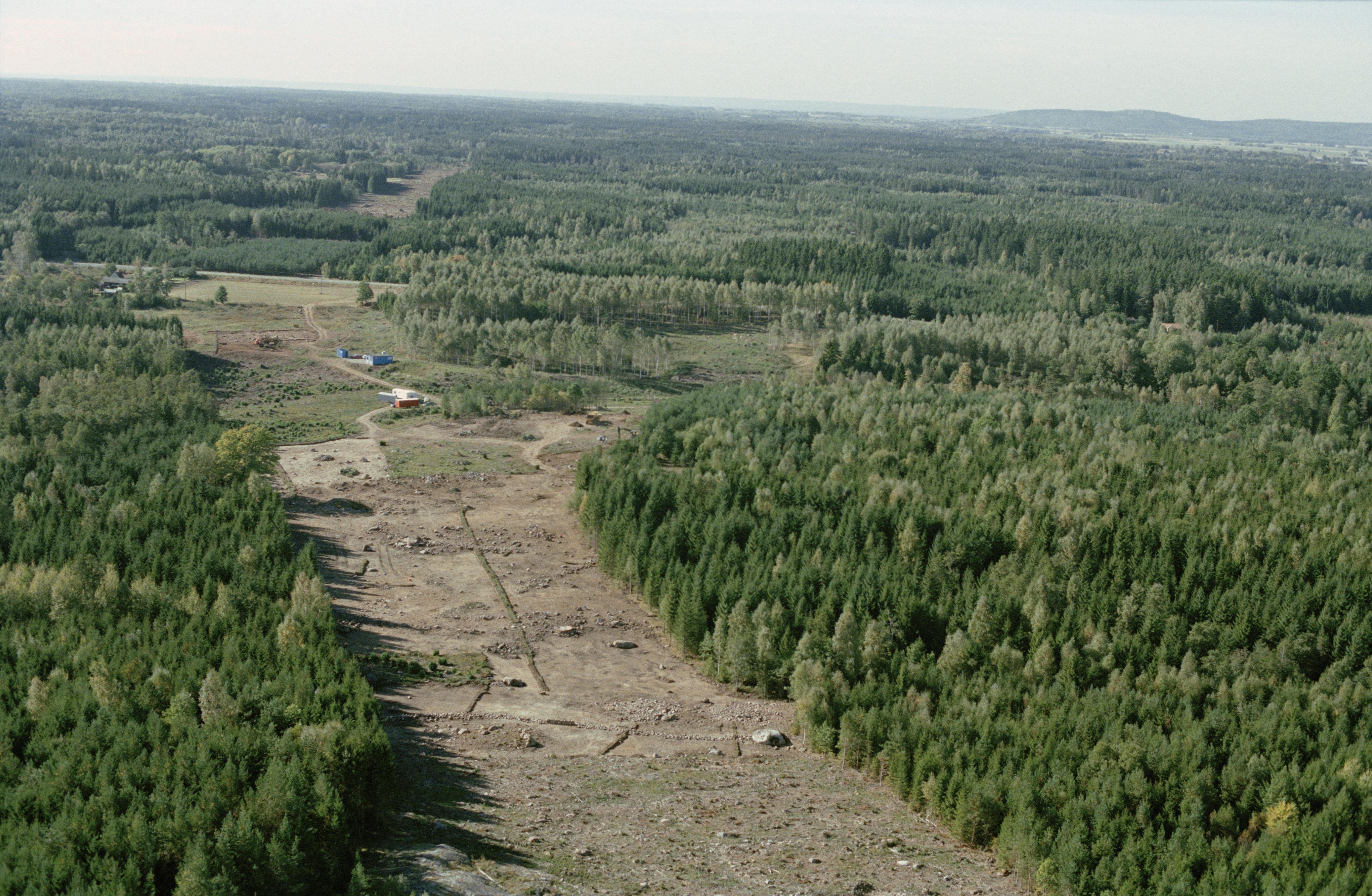 Beskrivning: Arkeologisk undersökning innan väg E4 byggs söder om tätorten Väderstad. Stensträngar RAÄnr Väderstad 172:1 och fossil åker Väderstad 245:1-2, 289:1-2 m.fl, vid trafikplats Nyhem. Bilden är tagen mot (väderstreck): VSV