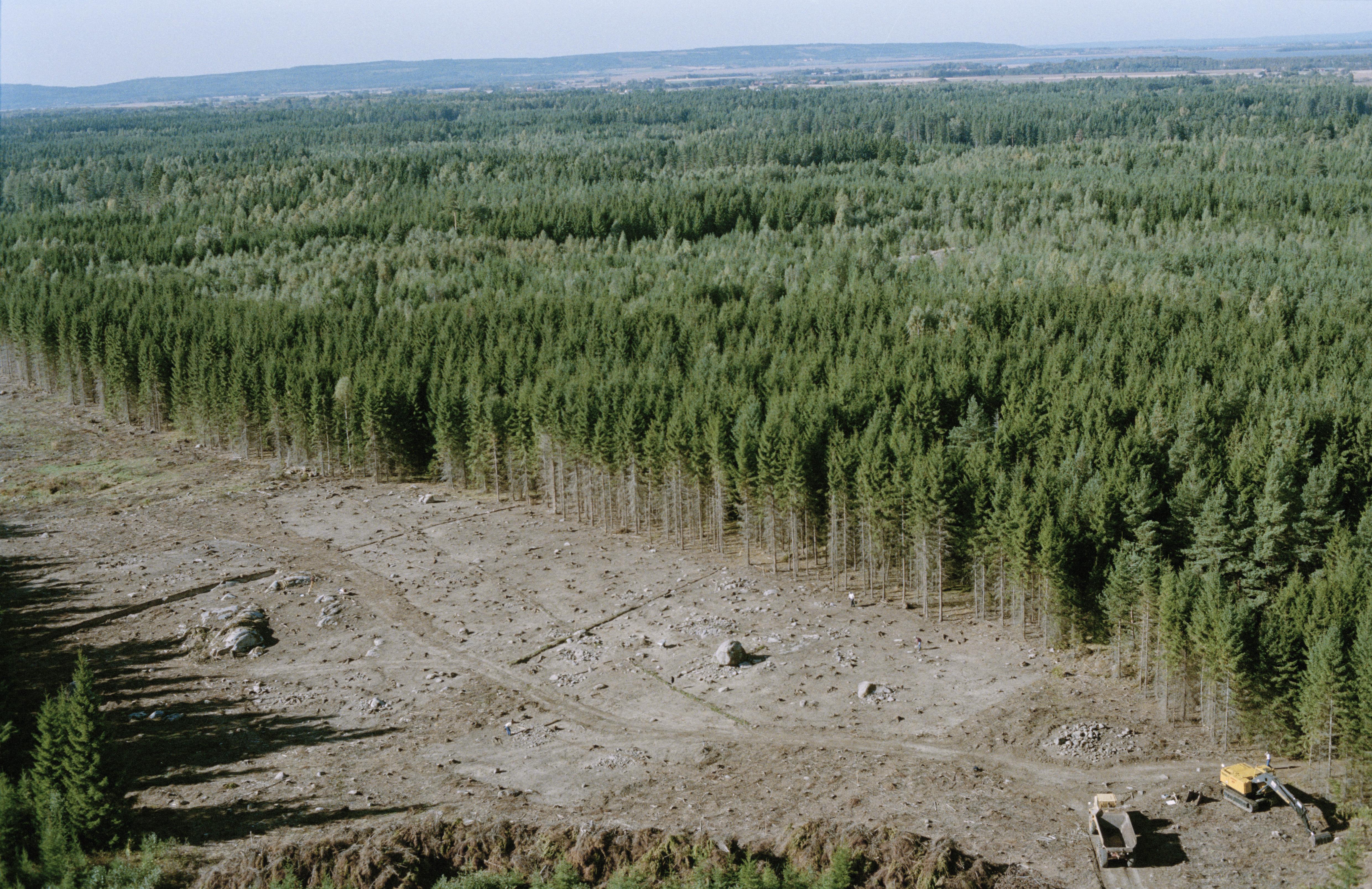 Beskrivning: Arkeologisk undersökning innan väg E4 byggs söder om tätorten Väderstad. Ospecificerad plats, men troligen vid fossil åker RAÄnr Väderstad 407 m.fl. i området vid trafikplats Nyhem och Åsabackarna. Bilden är tagen mot (väderstreck): NV