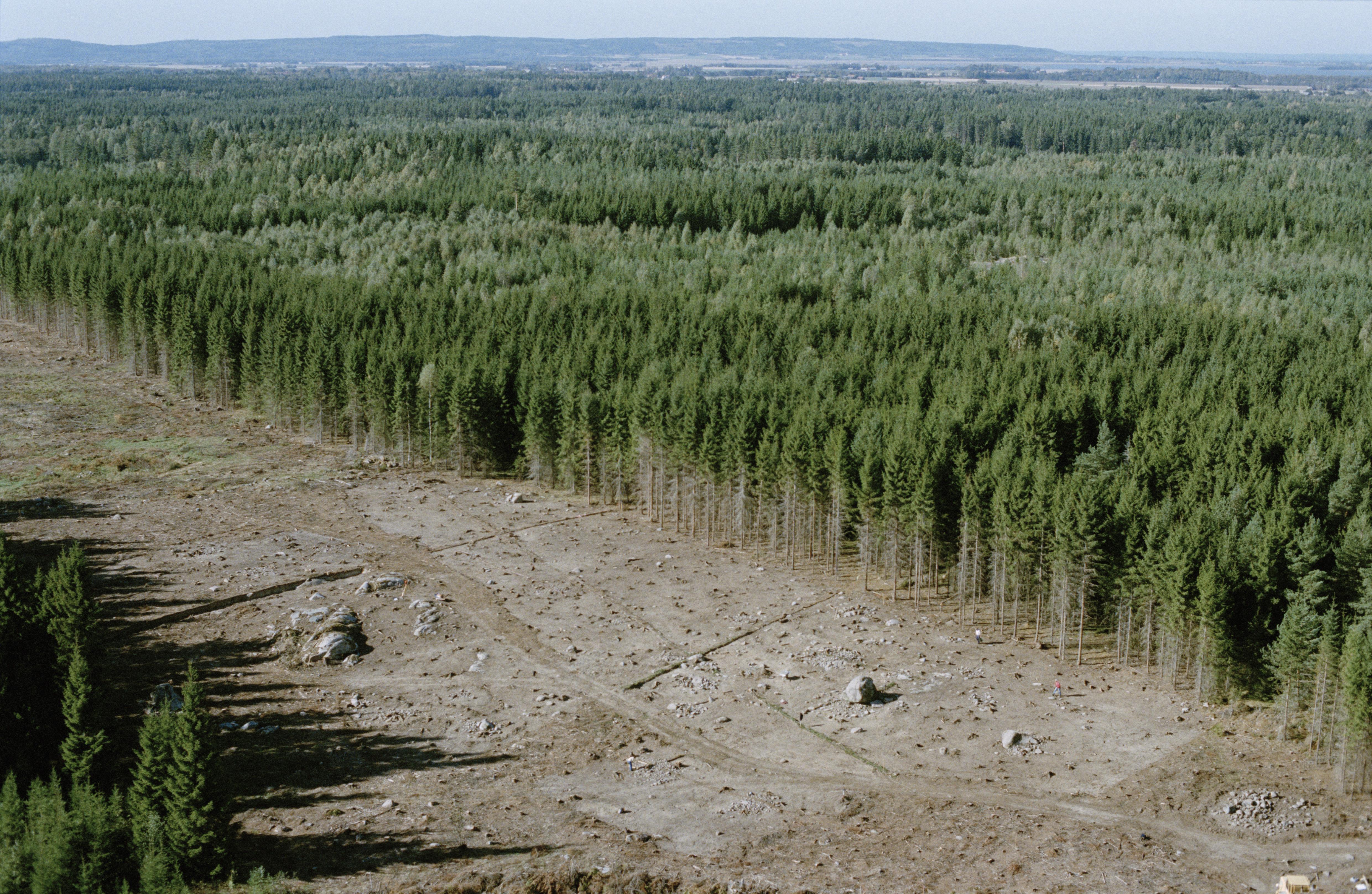 Beskrivning: Arkeologisk undersökning innan väg E4 byggs söder om tätorten Väderstad. Ospecificerad plats, men troligen vid fossil åker RAÄnr Väderstad 407 m.fl. i området vid trafikplats Nyhem och Åsabackarna. Bilden är tagen mot (väderstreck): NV