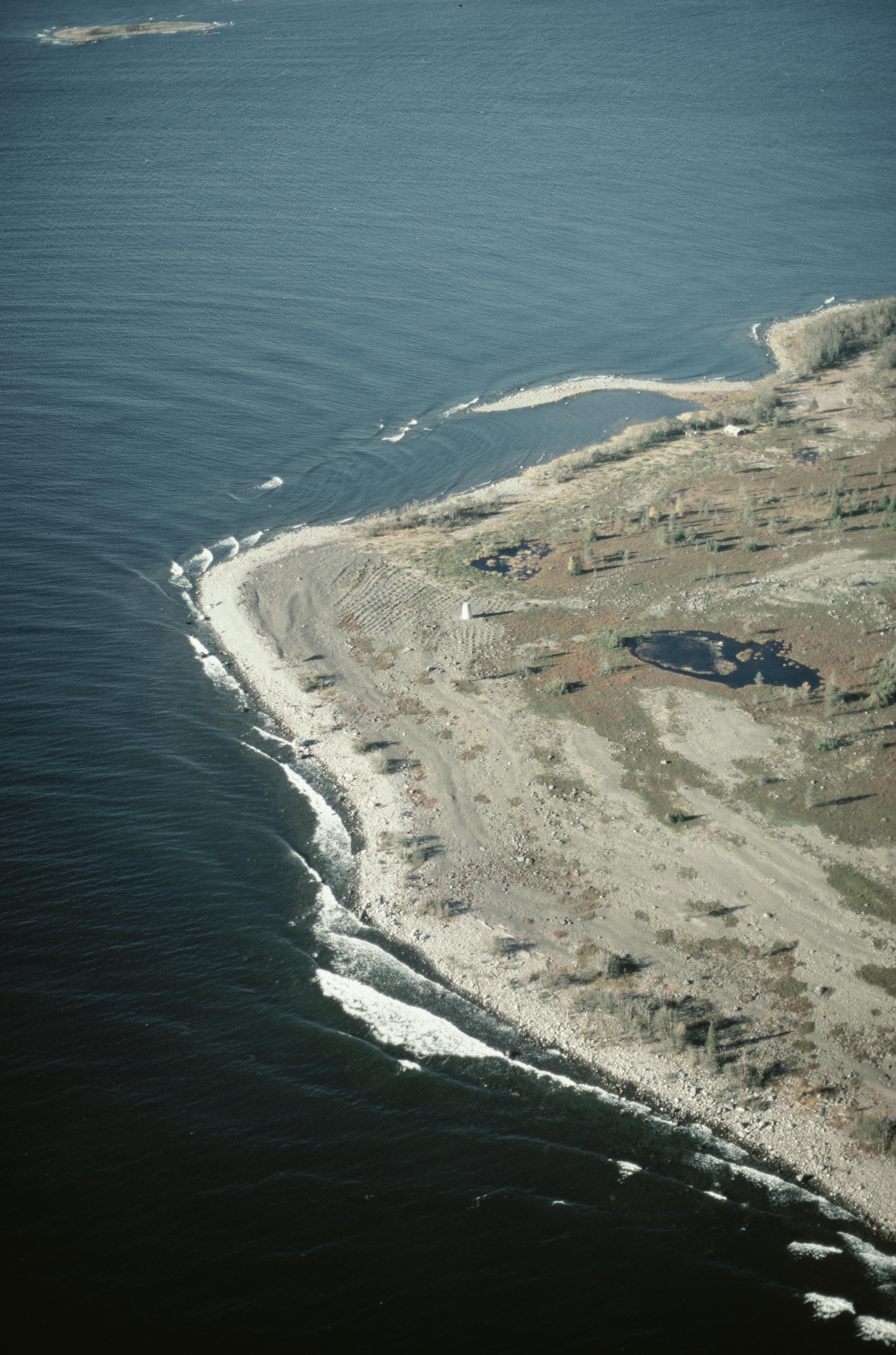 Beskrivning: Ön Stor-Fjäderägg (skrivs även Stora Fjäderägg), sydostra delen. Vid bildens mitt Mickelsudden och Lillgrundsrevet. Nere till höger labyrint RAÄnr Holmön 34:1 och 35:1 samt fiskeläge Holmön 67 vid Kyrkdiket. Stor Fjäderägg ingår i ögruppen Holmöarna i sundet Norra Kvarken. Bilden är tagen mot (väderstreck): VSV