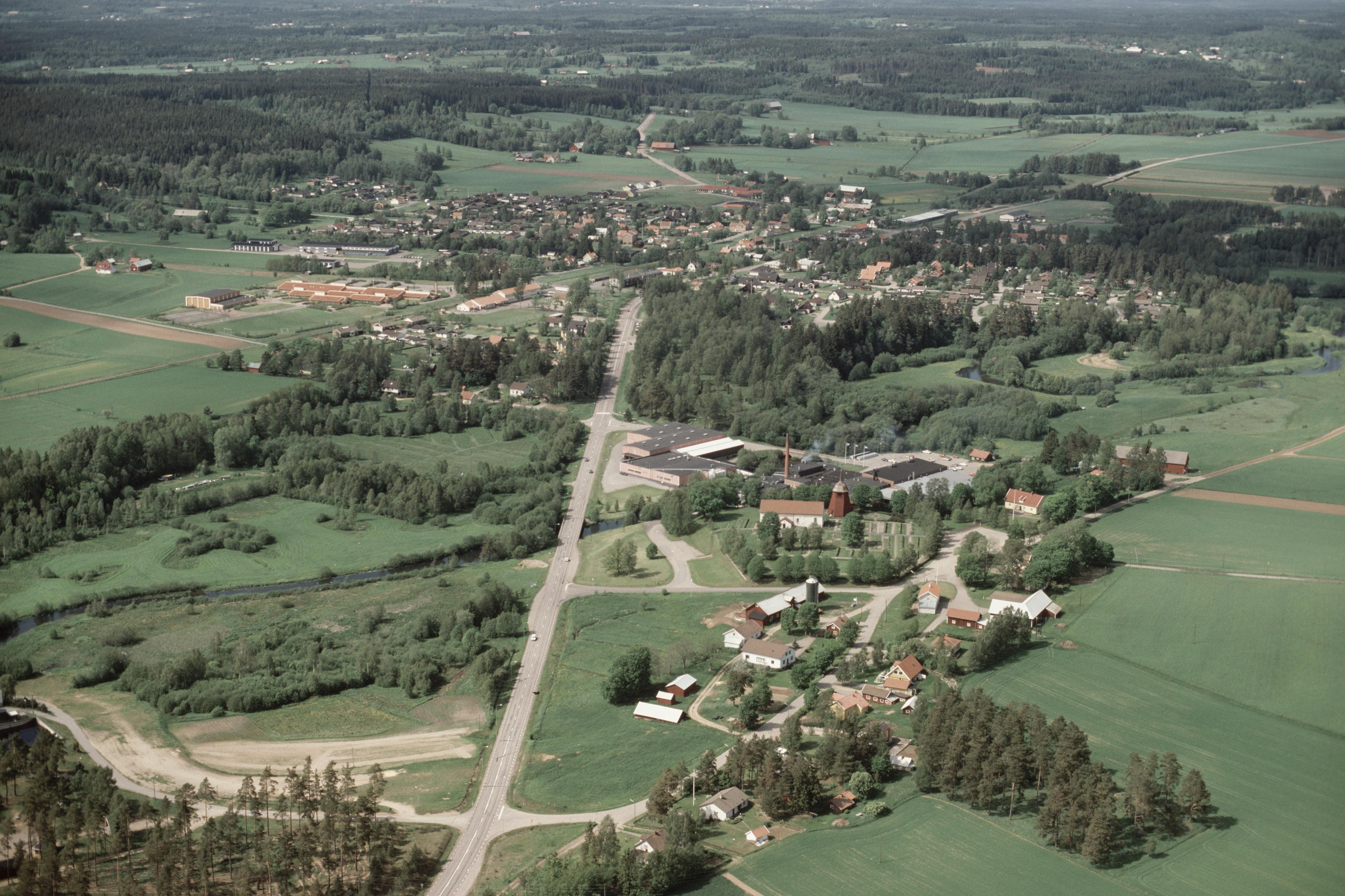 Beskrivning: Timmele kyrka och tätort. Till höger om bildens mitt gravfält RAÄnr Timmele 45:1 och färdväg Timmele 45:2. Bilden är tagen mot (väderstreck): NV