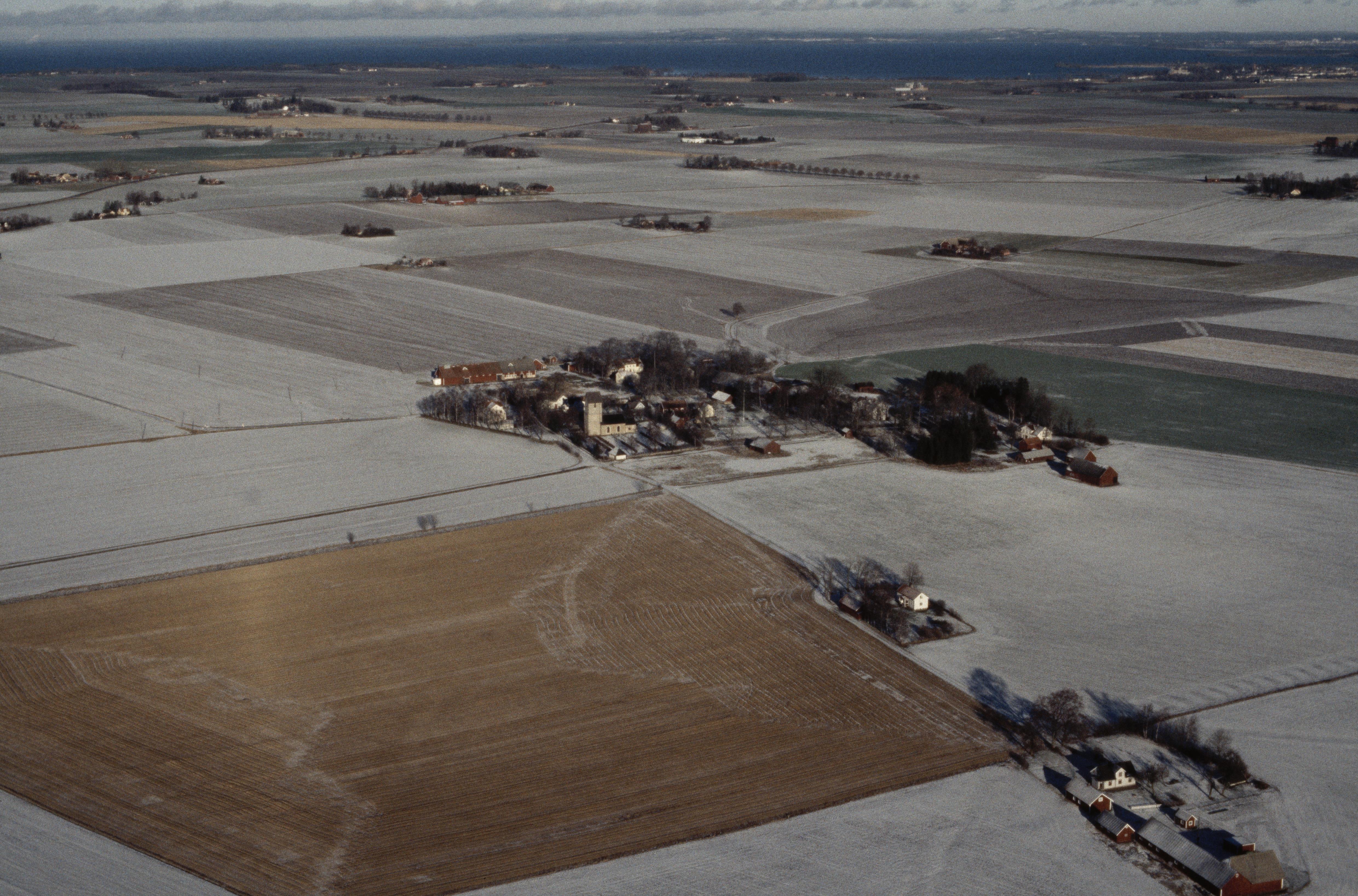 Beskrivning: Herrestads kyrka och kyrkby. Bilden är tagen mot (väderstreck): N