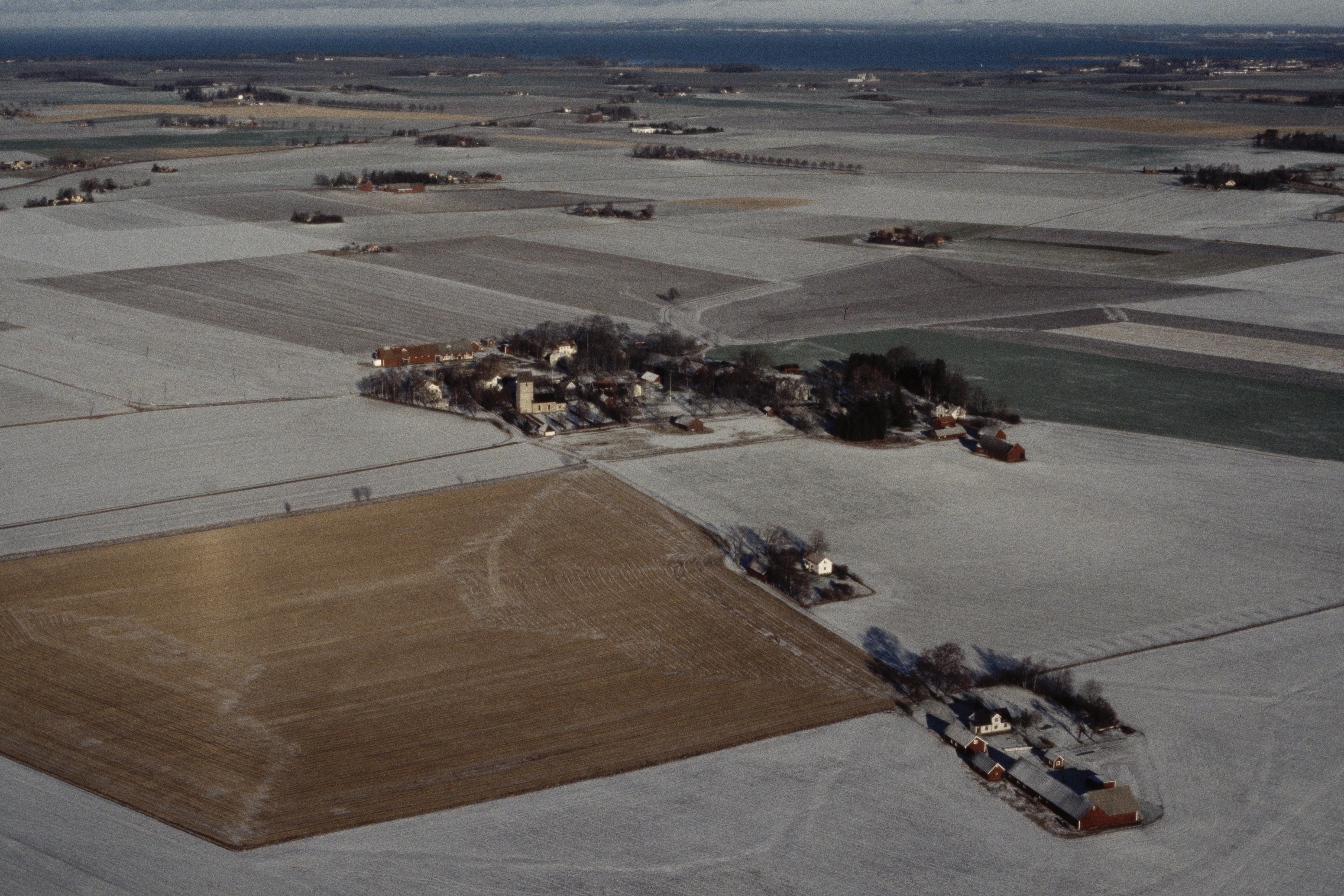 Beskrivning: Herrestads kyrka och kyrkby. Bilden är tagen mot (väderstreck): N