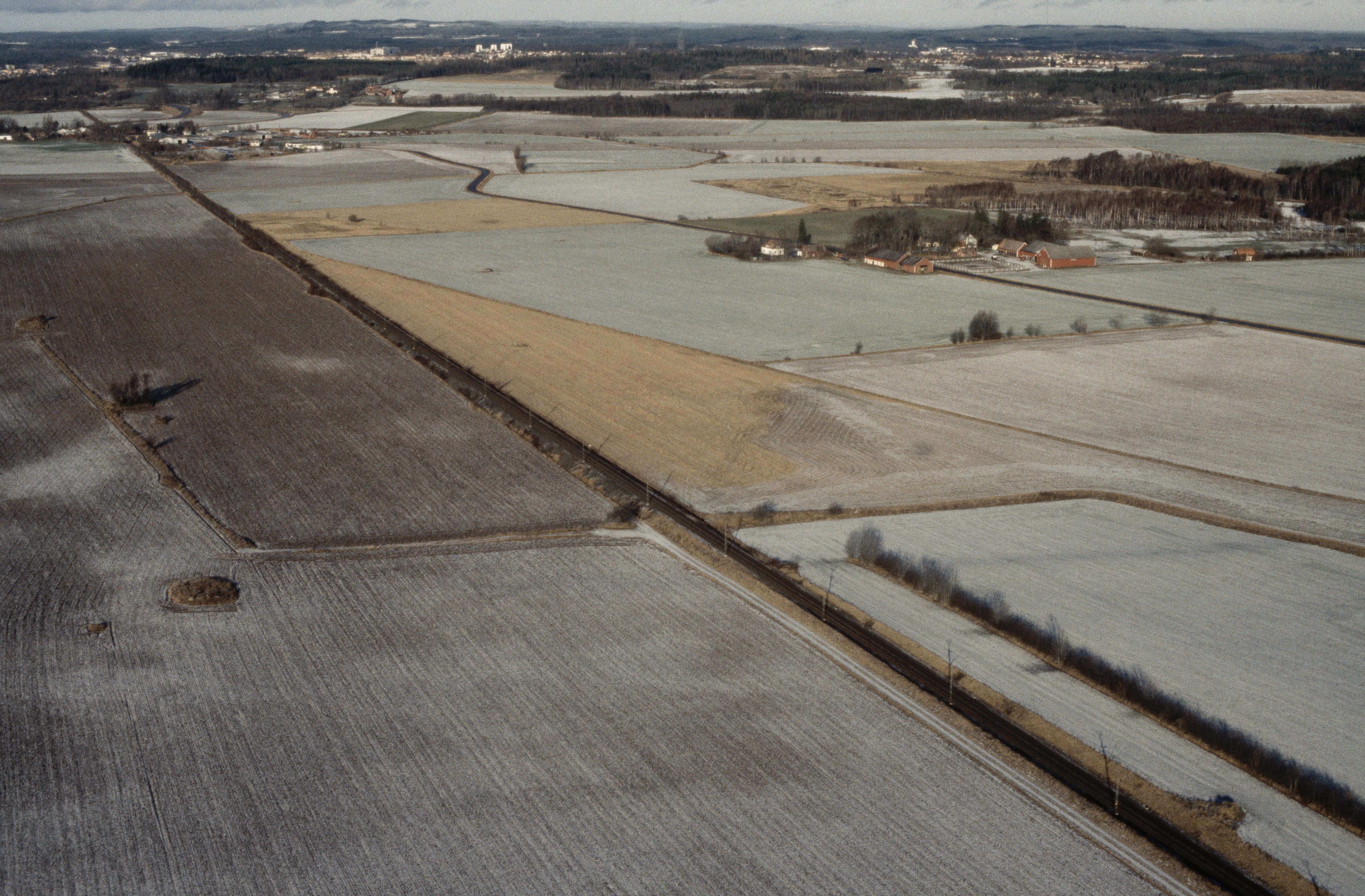 Beskrivning: Järnbanespår genom Nyckelby, norrost om Sten. Västergården uppe till höger med boplats RAÄnr Västra Stemby 107:1 och lägenhetsbebyggelse Västra Stenby 145. Bilden är tagen mot (väderstreck): NO