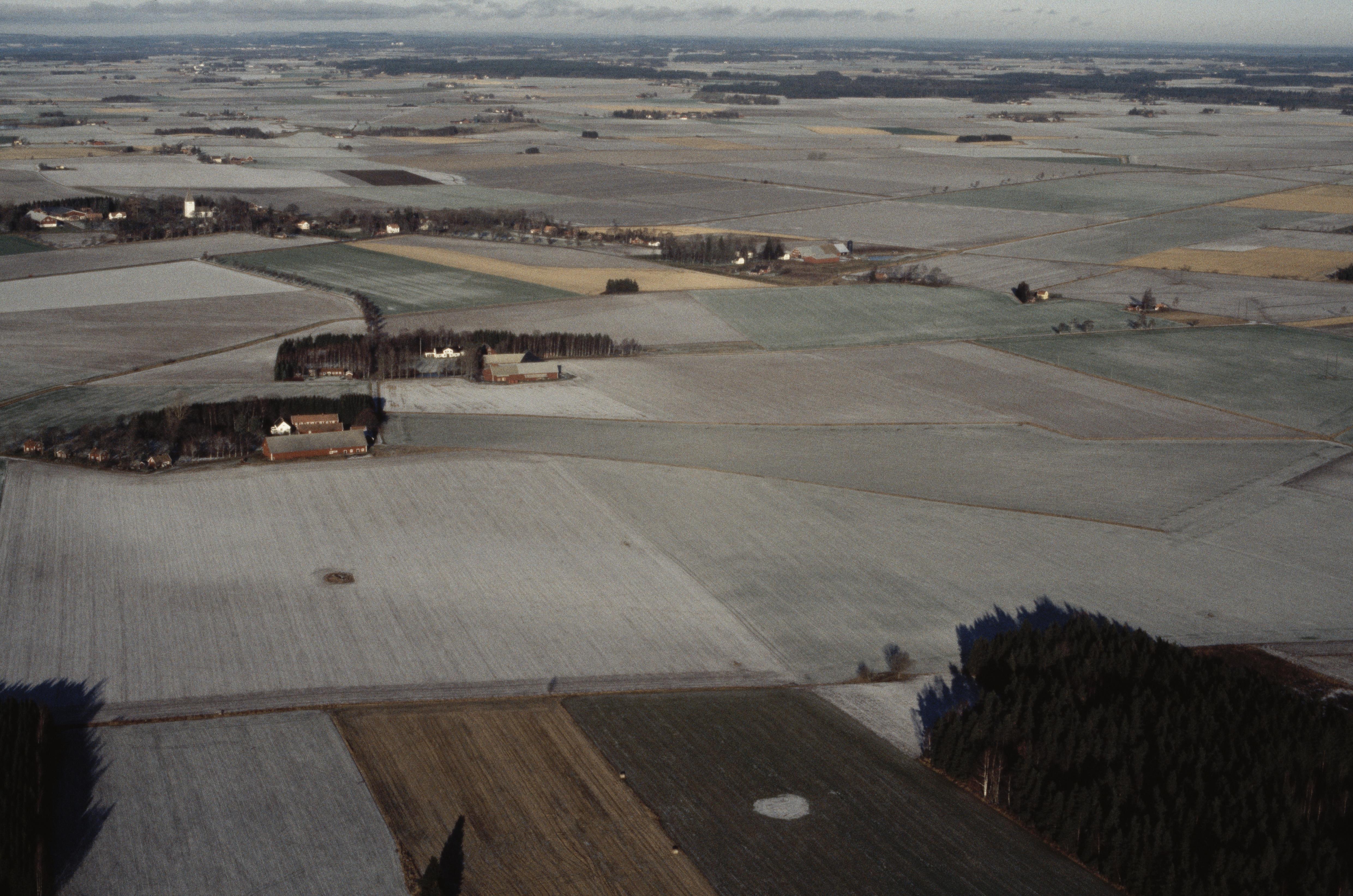 Beskrivning: Övertorps gård. Bjälbo kyrka och kyrkby till vänster i bildens övre de. Bilden är tagen mot (väderstreck): NNV
