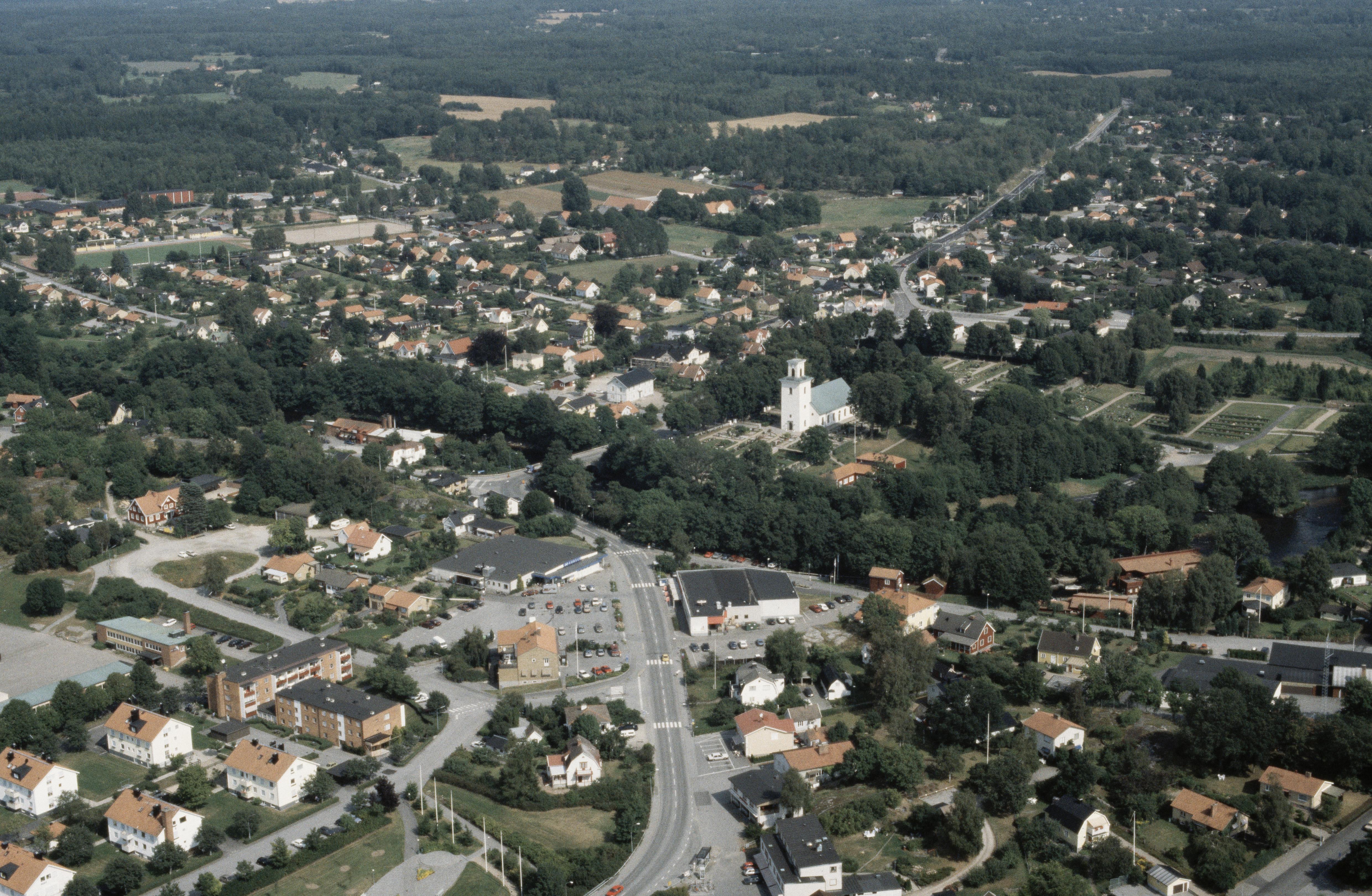 Tätorten Mörrum vid Mörrumsån. Mörrums kyrka vid bildens mitt. Bilden är tagen mot (väderstreck): NO