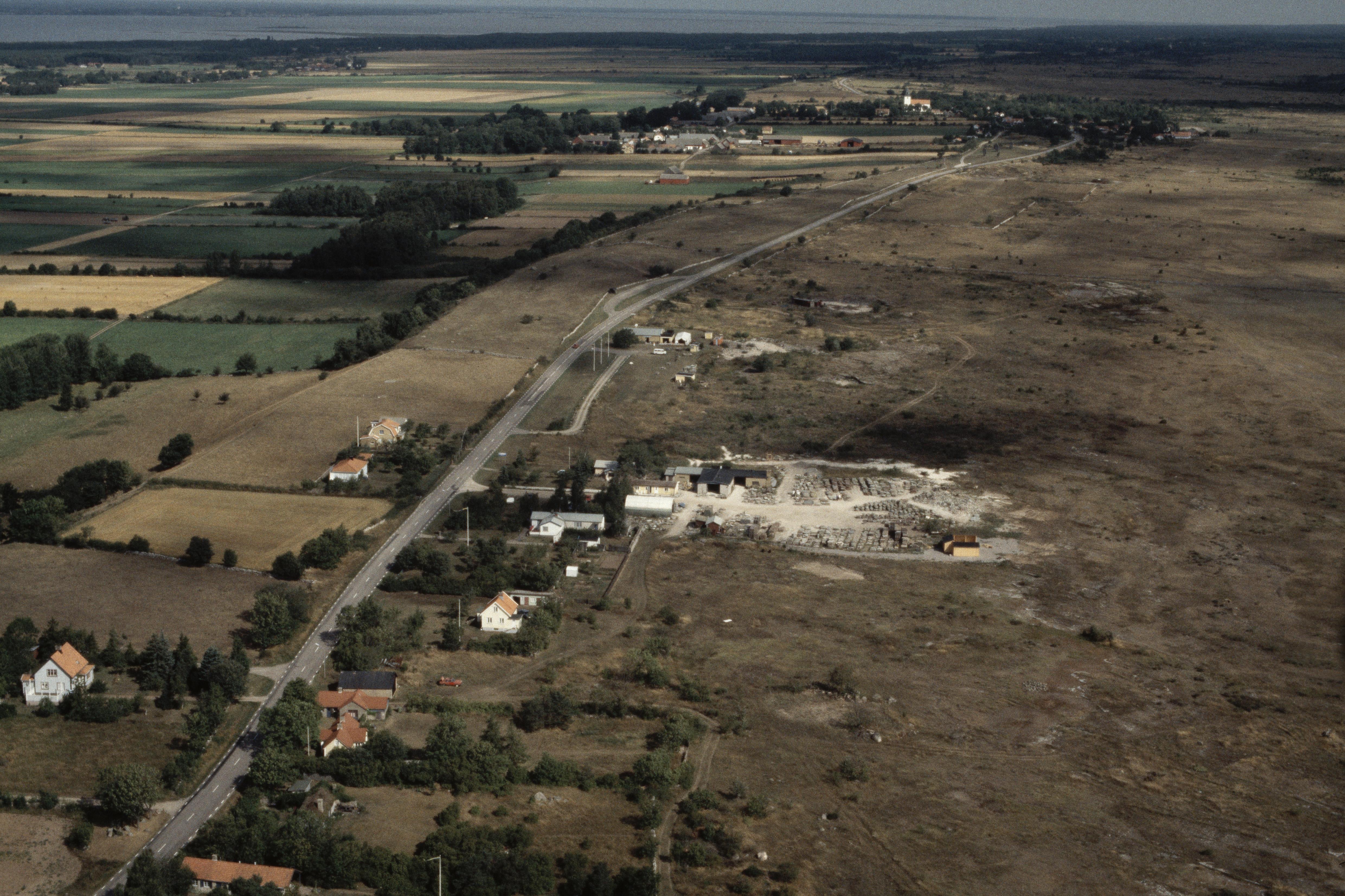 Beskrivning: Alvaret. Reso kyrkby. Resmo kyrka i bildens övre del. Bilden är tagen mot (väderstreck): N