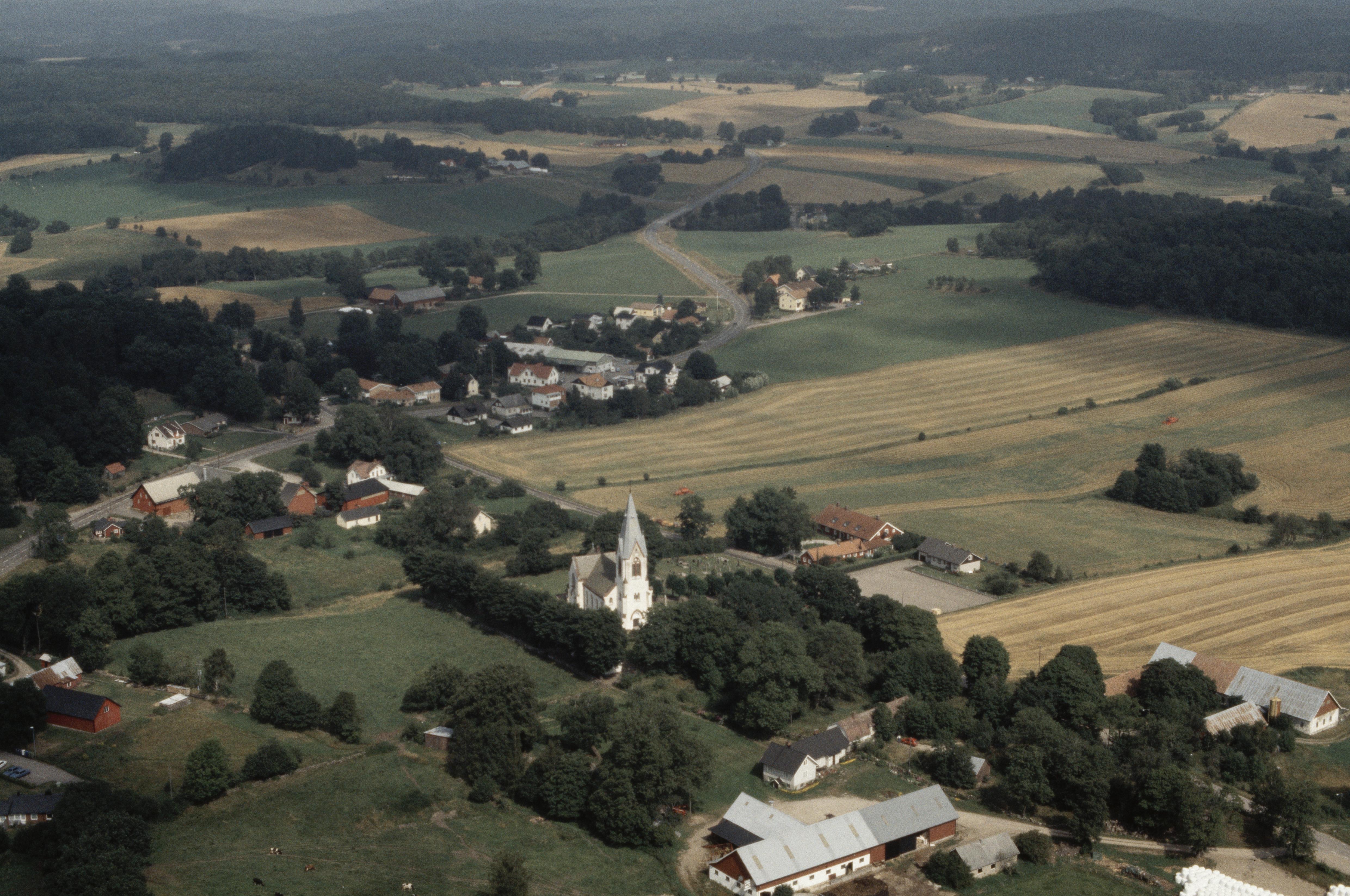 Beskrivning: Köinge kyrka och kyrkby i Ätradalen. Bilden är tagen mot (väderstreck): NO
