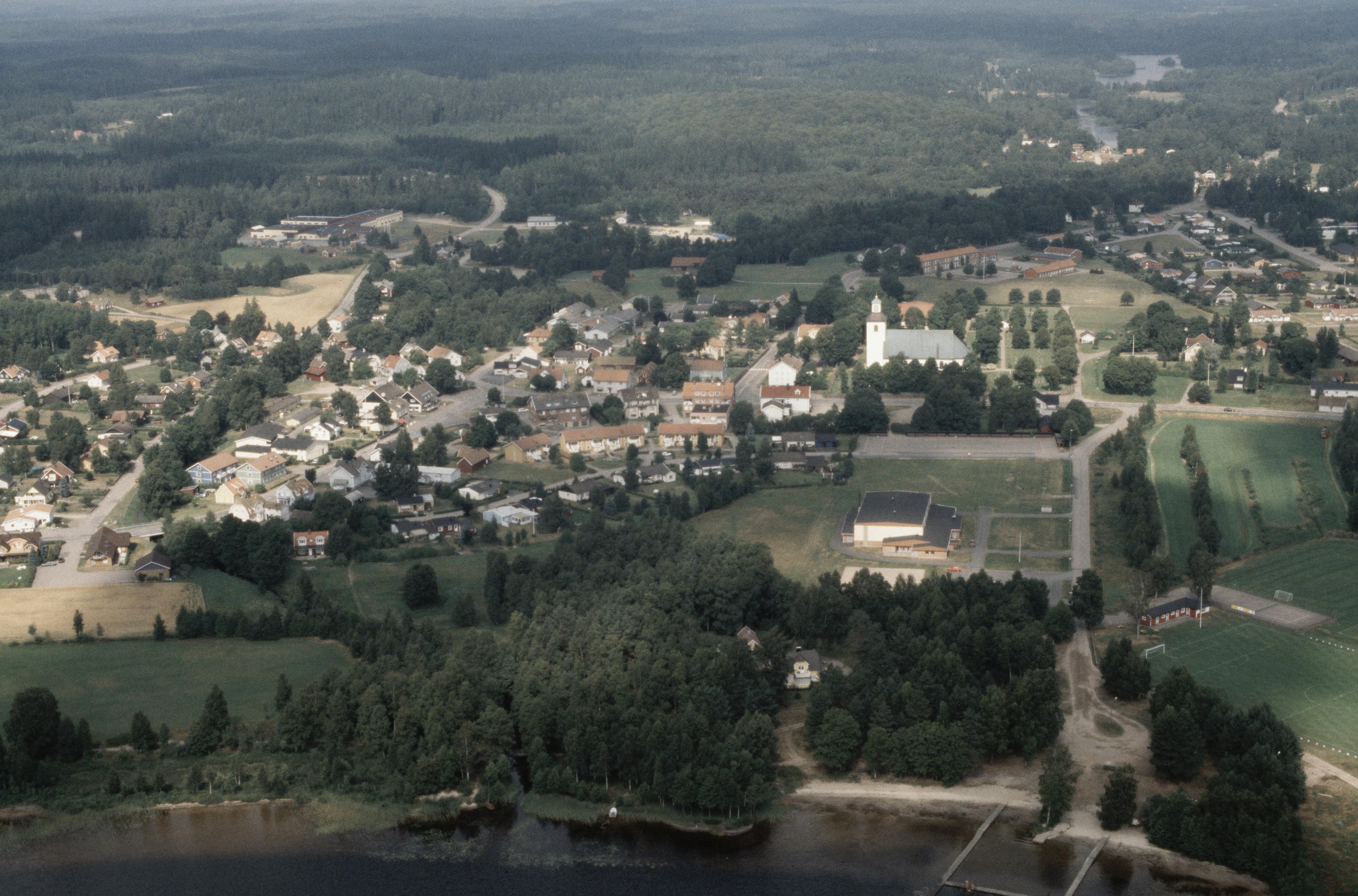 Beskrivning: Unnaryds tätort vid sjön Unnen. Södra Unnaryds kyrka uppe till höger. Bilden är tagen mot (väderstreck): N