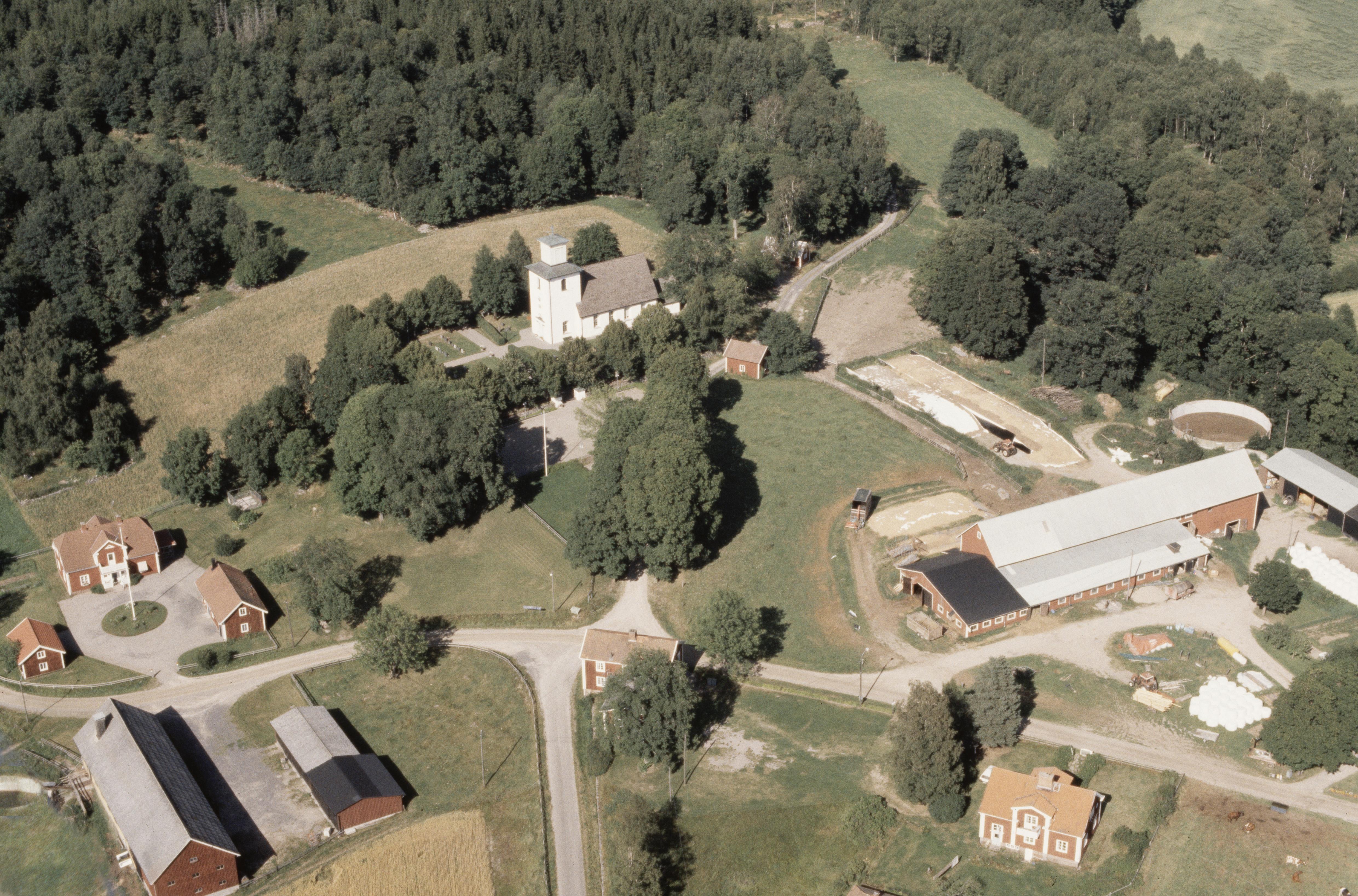 Beskrivning: Ormesberga kyrka och kyrkby. Vid bildens mitt bytomt RAÄnr Ormesberga 55:1. Bilden är tagen mot (väderstreck): NO