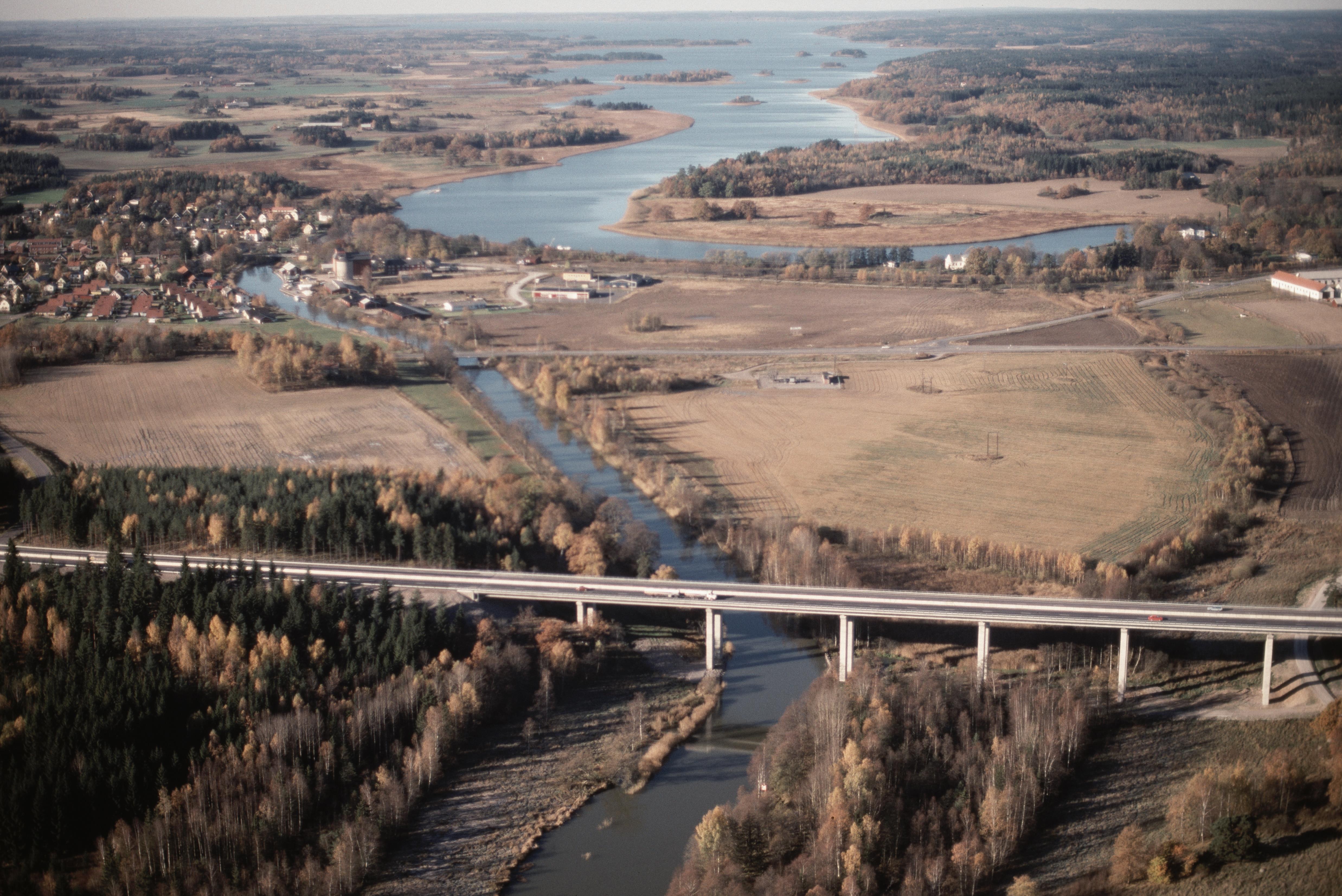 Beskrivning: Göta kanal vid tätorten Norsholm. Motala ström till höger i bildens övre del. Kanalmärke RAÄnr Kimstad 211:1 vid bildens mitt. Uppe till vänster Skärkinds socken. Bilden är tagen mot (väderstreck): V