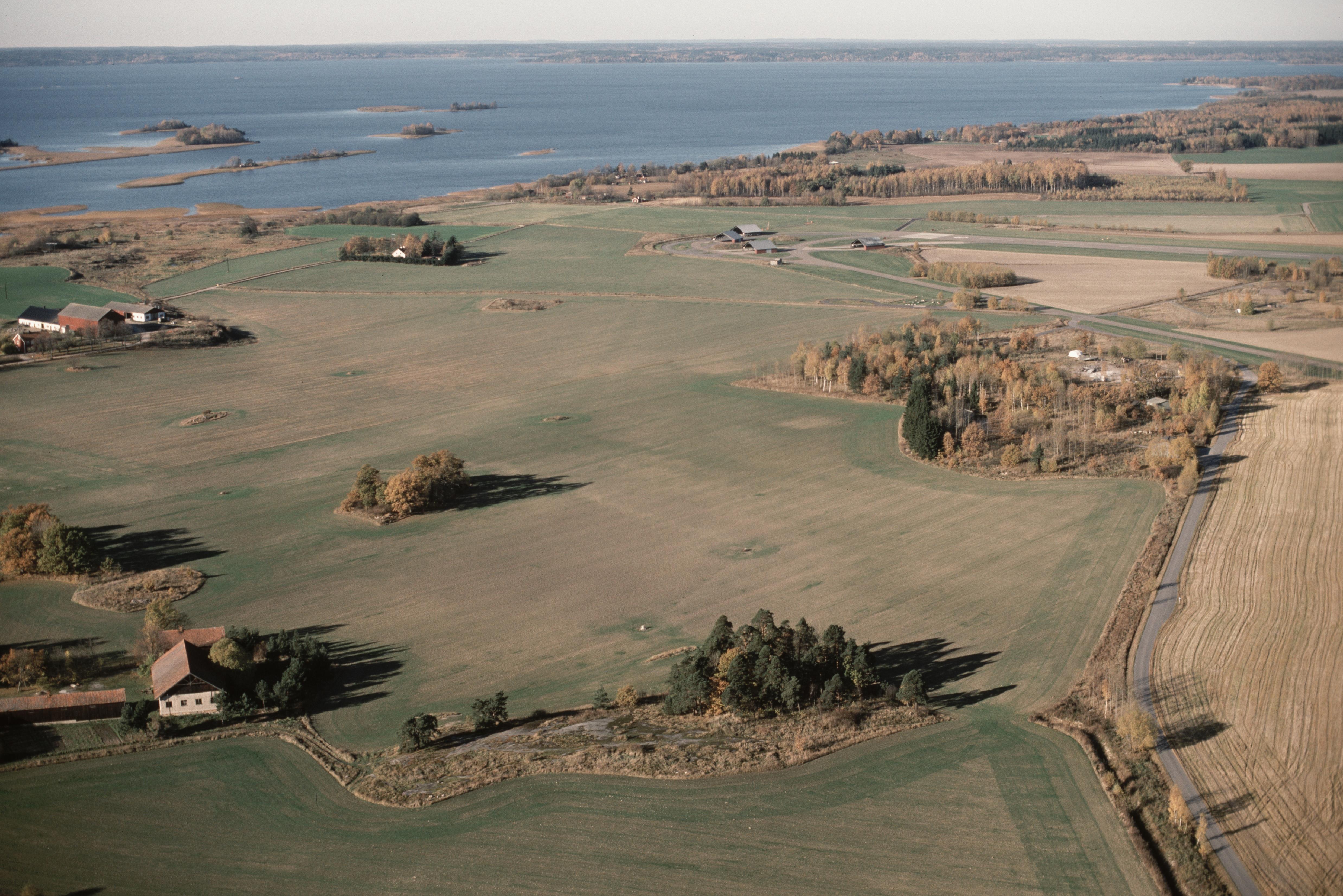 Beskrivning: (Tid. Östra Eneby socken). Hällristningar RAÄnr Östra Eneby 23:1, 29:1-3, 77:1-3, 156:1 m.fl. vid gården Ekenberg (nere till vänster) och Leonardsbergs herrgård (uppe till vänster). Motala ström och sjön Glan i bildens övre del. Bilden är tagen mot (väderstreck): V