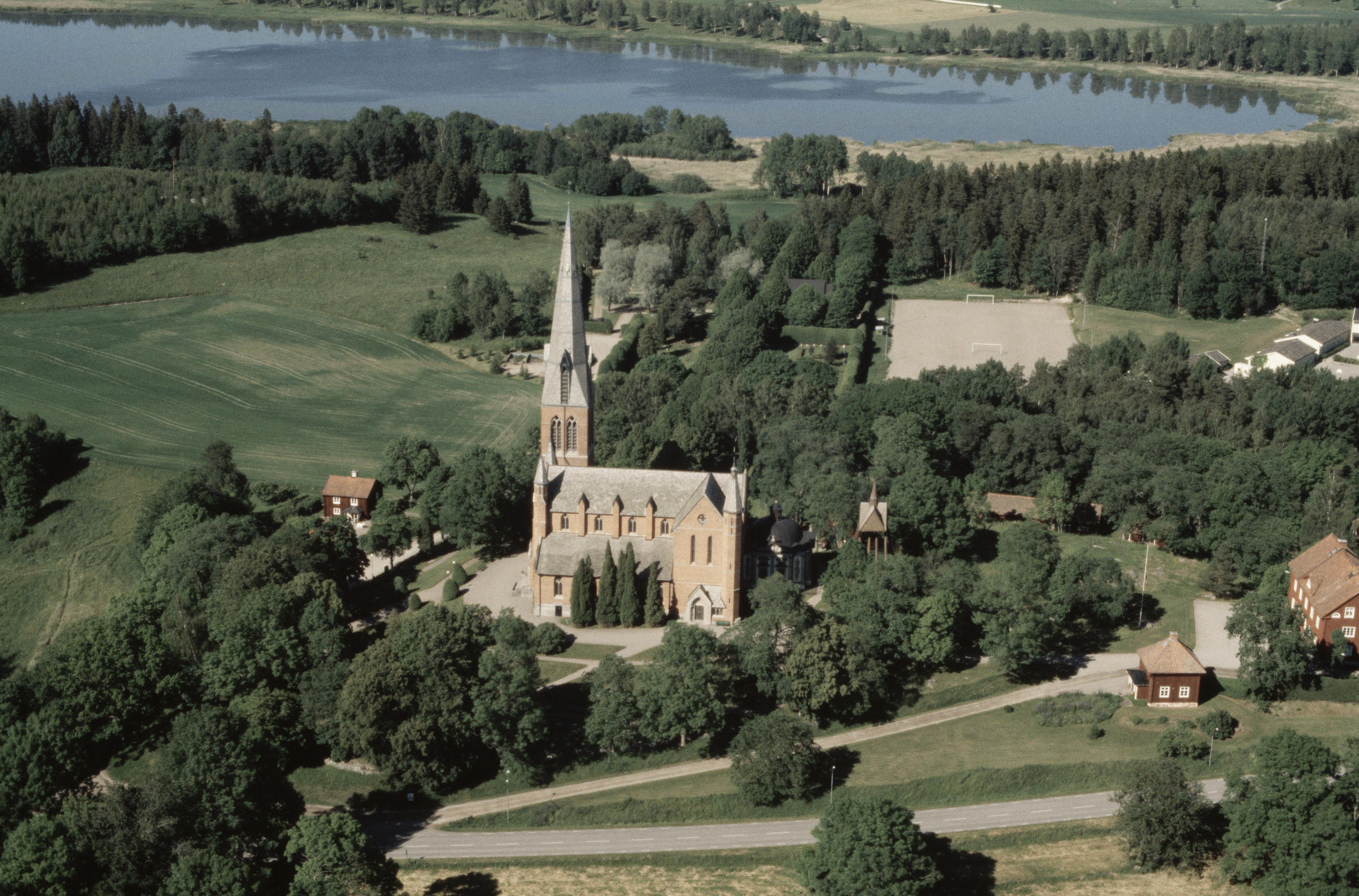 Beskrivning: Floda kyrka och kyrkby. I bildens övre del Kyrksjön. Bilden är tagen mot (väderstreck): N