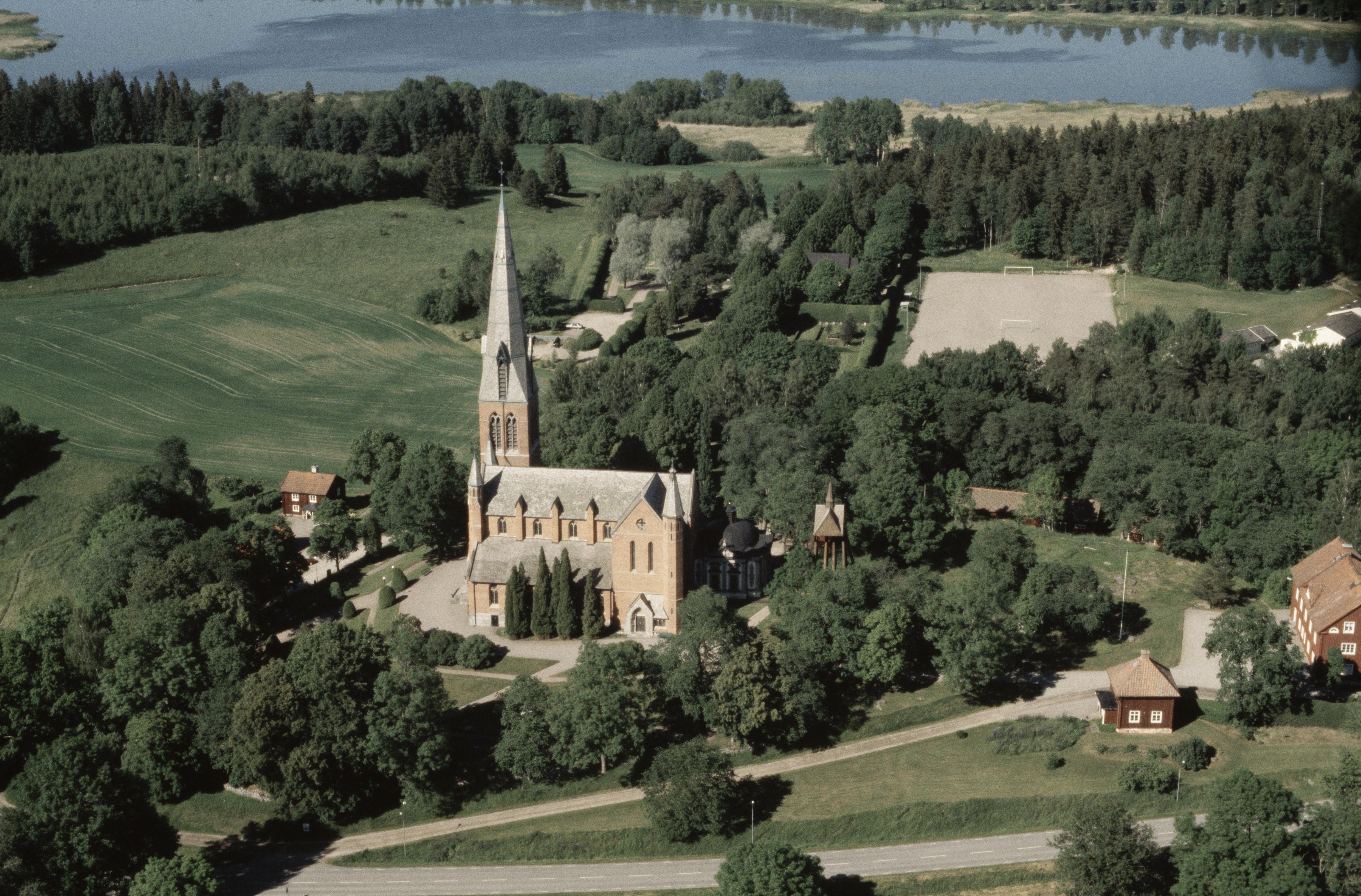 Beskrivning: Floda kyrka och kyrkby. I bildens övre del Kyrksjön. Bilden är tagen mot (väderstreck): N