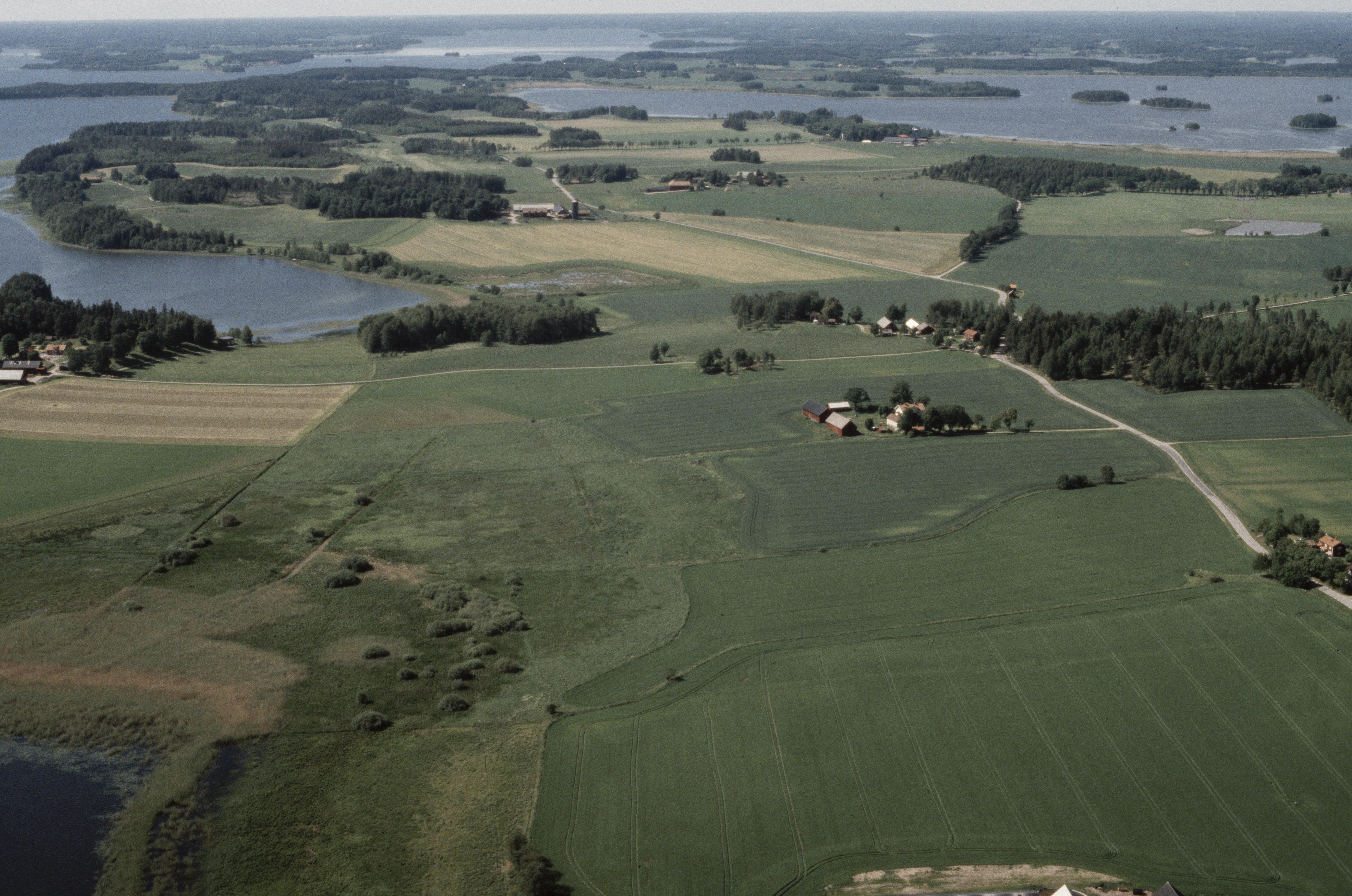 Beskrivning: Till vänster Fyrsjö gård vid sjön Yngarn. Vid bildens mitt Goglunda gård och till höger gravfält RAÄnr Stigtomta 110:1. Bilden är tagen mot (väderstreck): NV