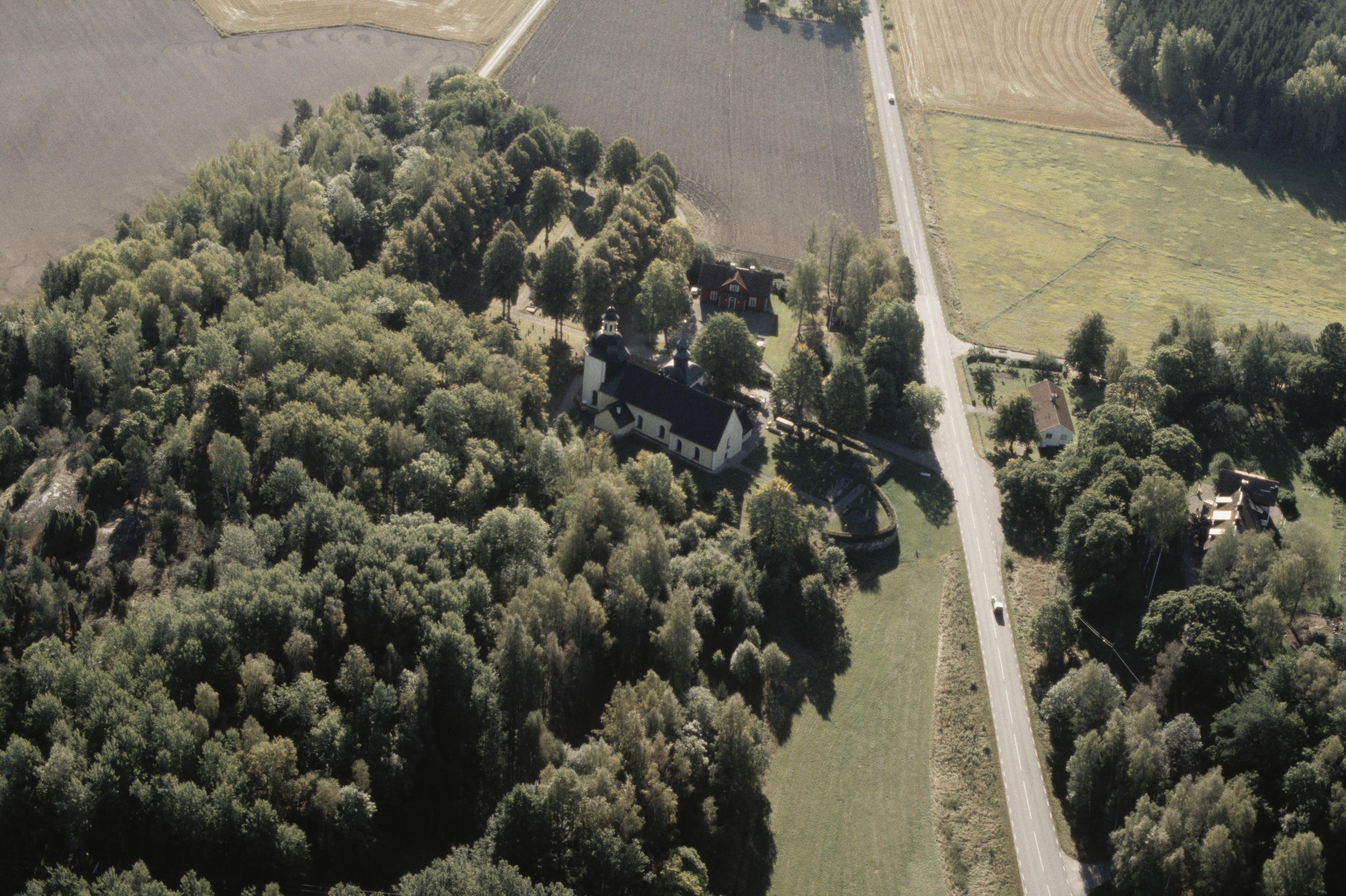 Beskrivning: Bälinge kyrka. Nere till vänster Klockarberget med stensättning RAÄnr Bälinge 136:1. Bilden är tagen mot (väderstreck): SO