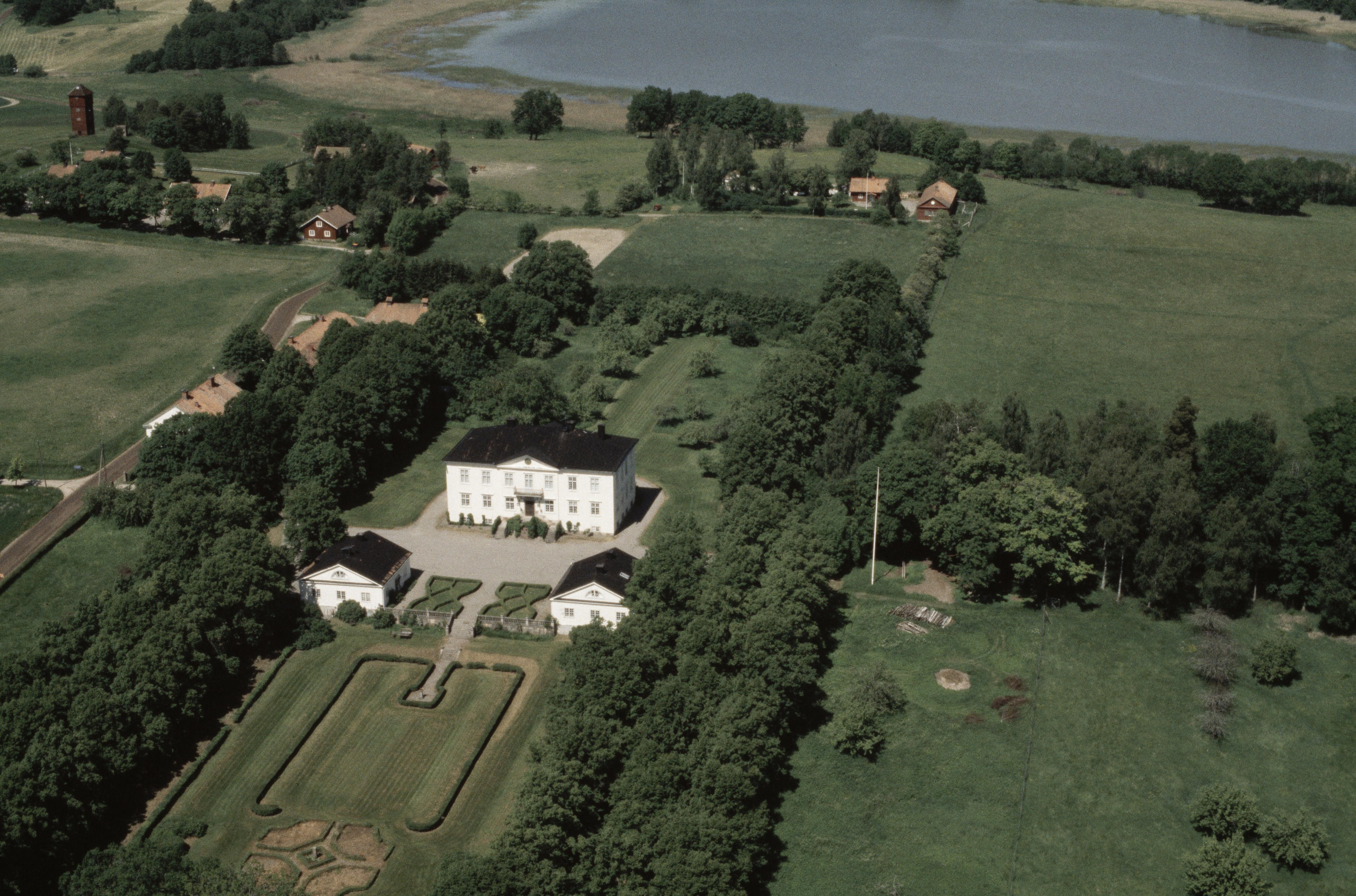 Beskrivning: Lindö herrgård. Vid herrgården minnesmärke RAÄnr Runtuna 69:1. I bildens övre del sjön Eknaren. Bilden är tagen mot (väderstreck): NV